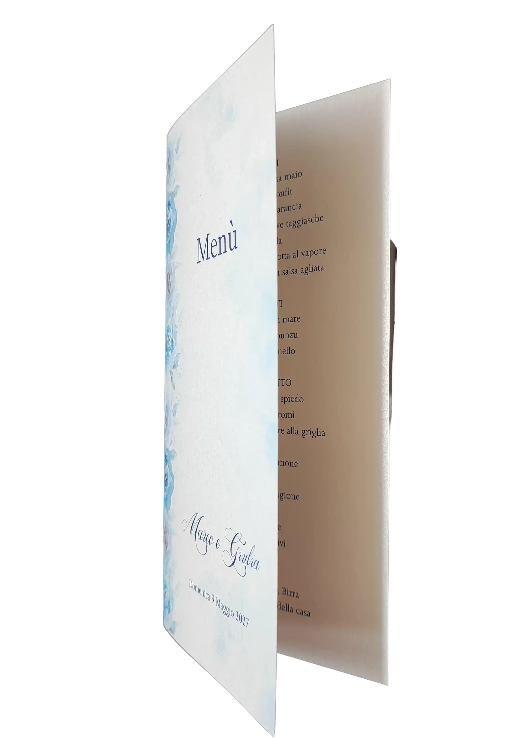 Il design esterno presenta i nomi degli sposi e la data in un font calligrafico delicato, mentre l’interno, spazioso e ordinato, permette una lettura chiara e piacevole delle portate.