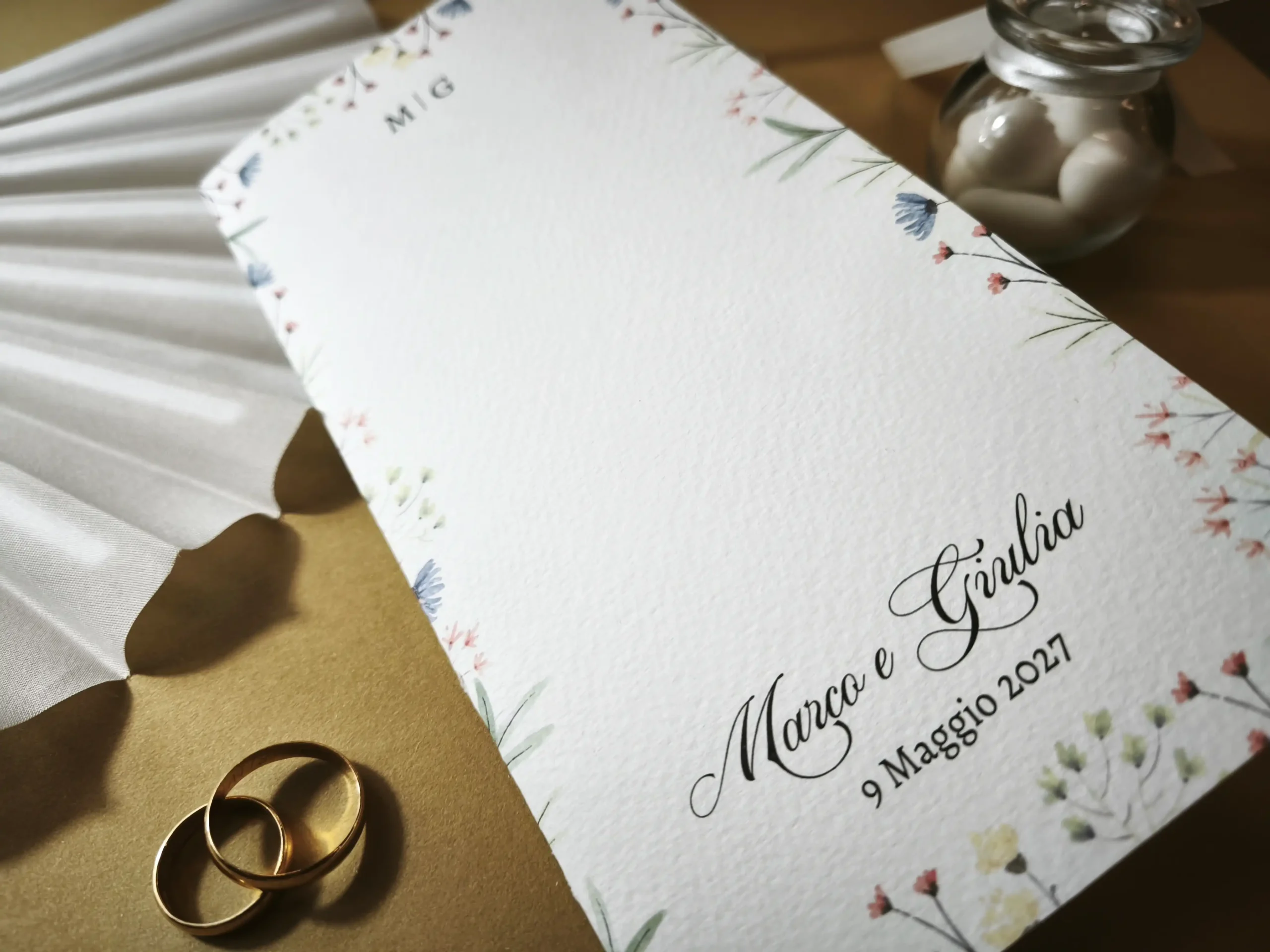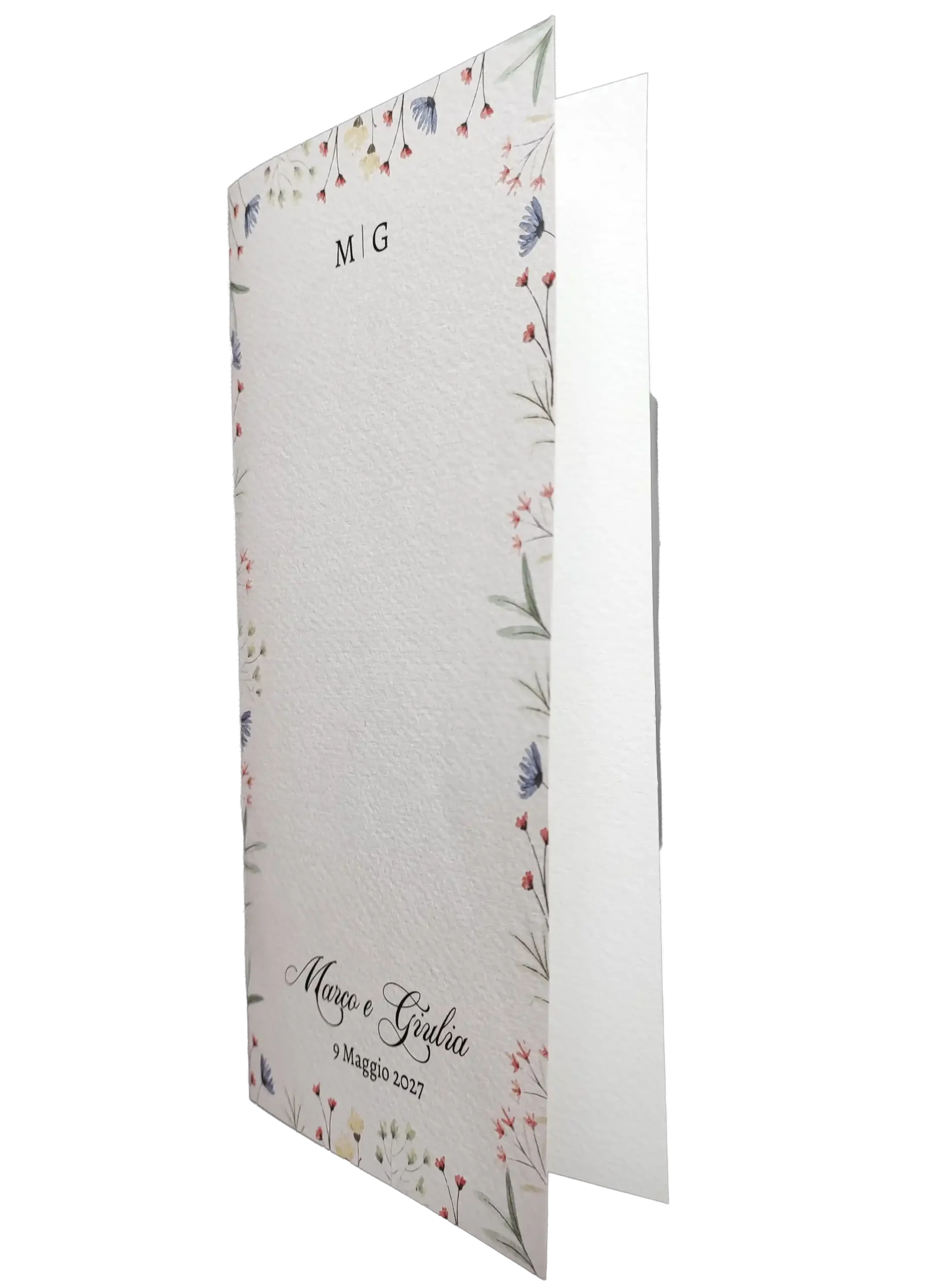 Realizzato in pregiata carta martellata color avorio da 260 gr, questo menù pieghevole è perfetto per chi desidera un’estetica botanica e floreale.