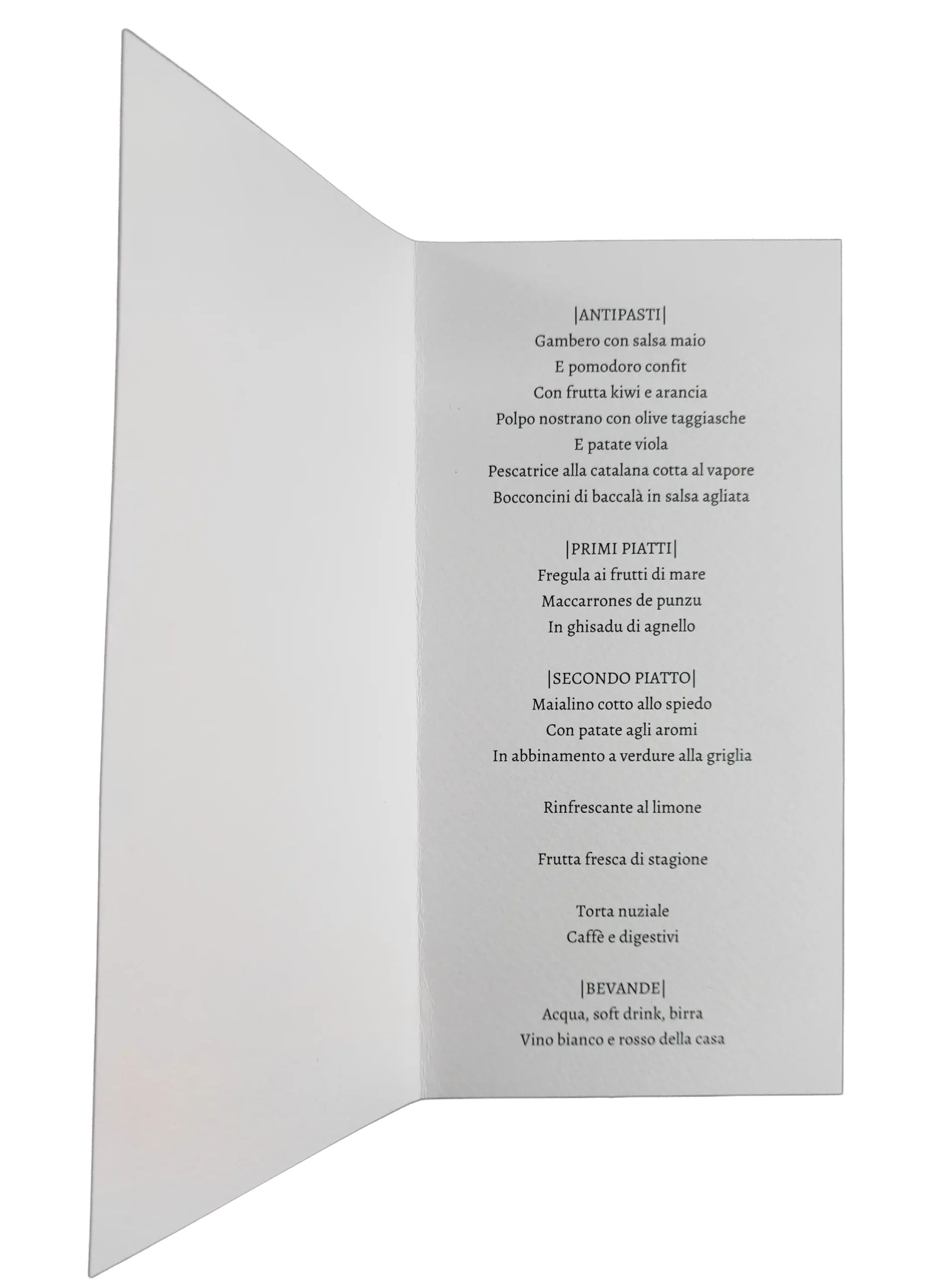 La robustezza del cartoncino garantisce che il menù resti perfettamente in posa sul tavolo, diventando un vero e proprio elemento decorativo della vostra mise en place.
