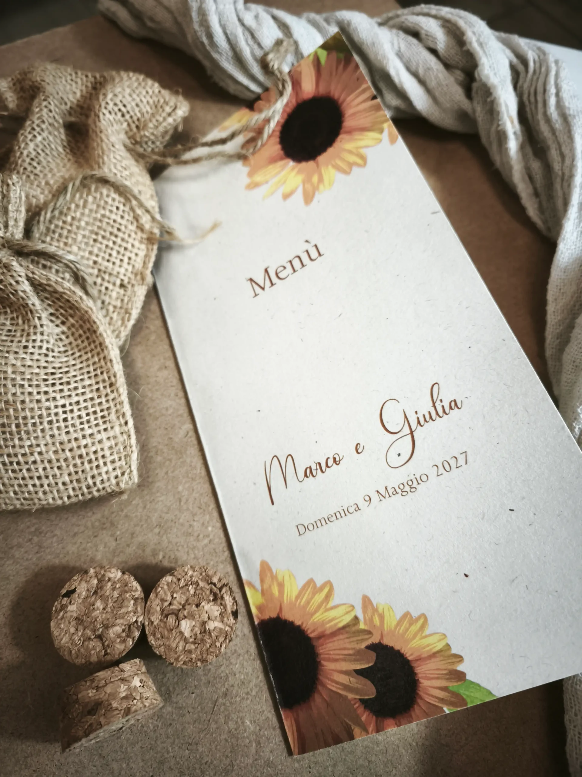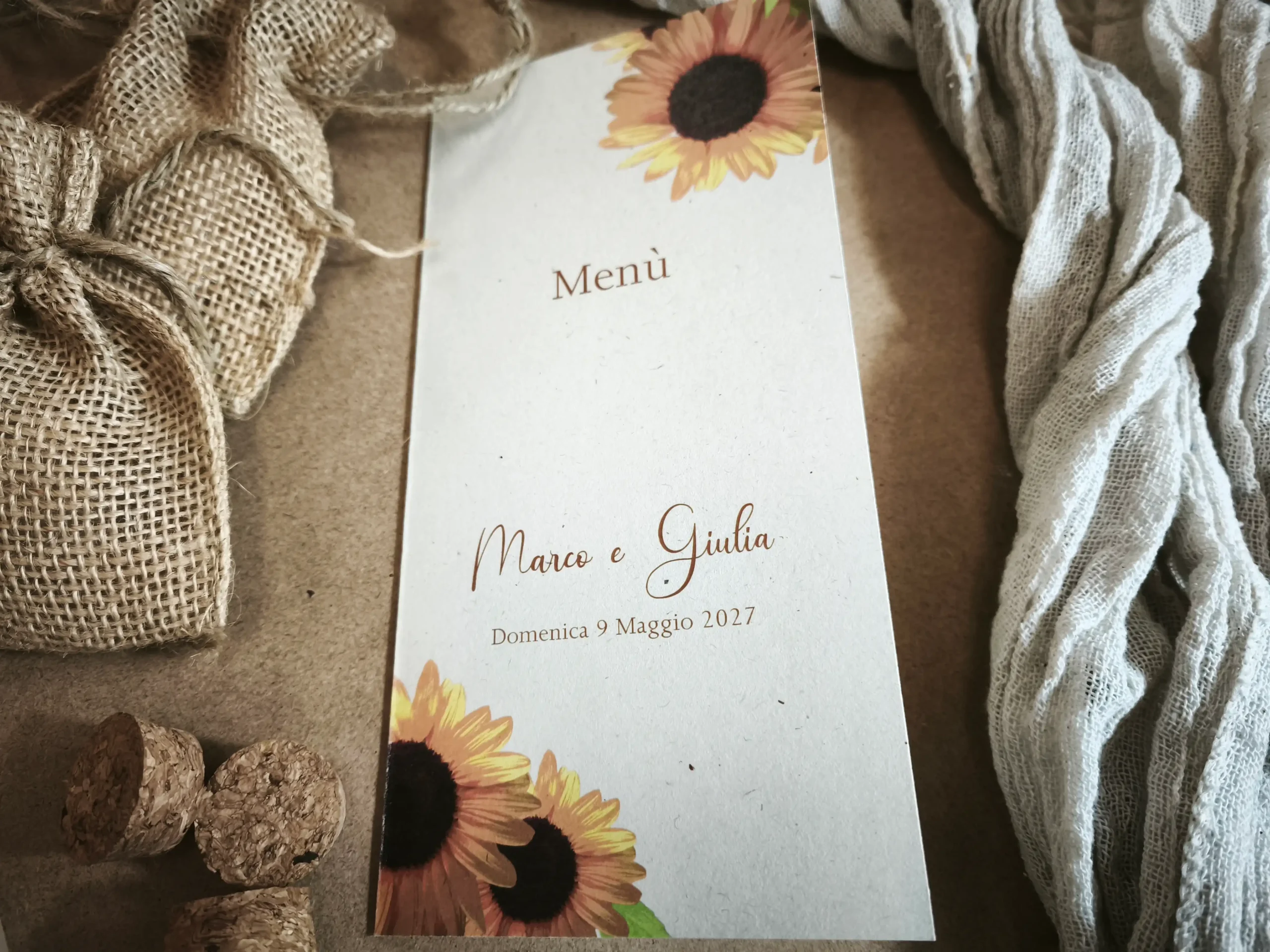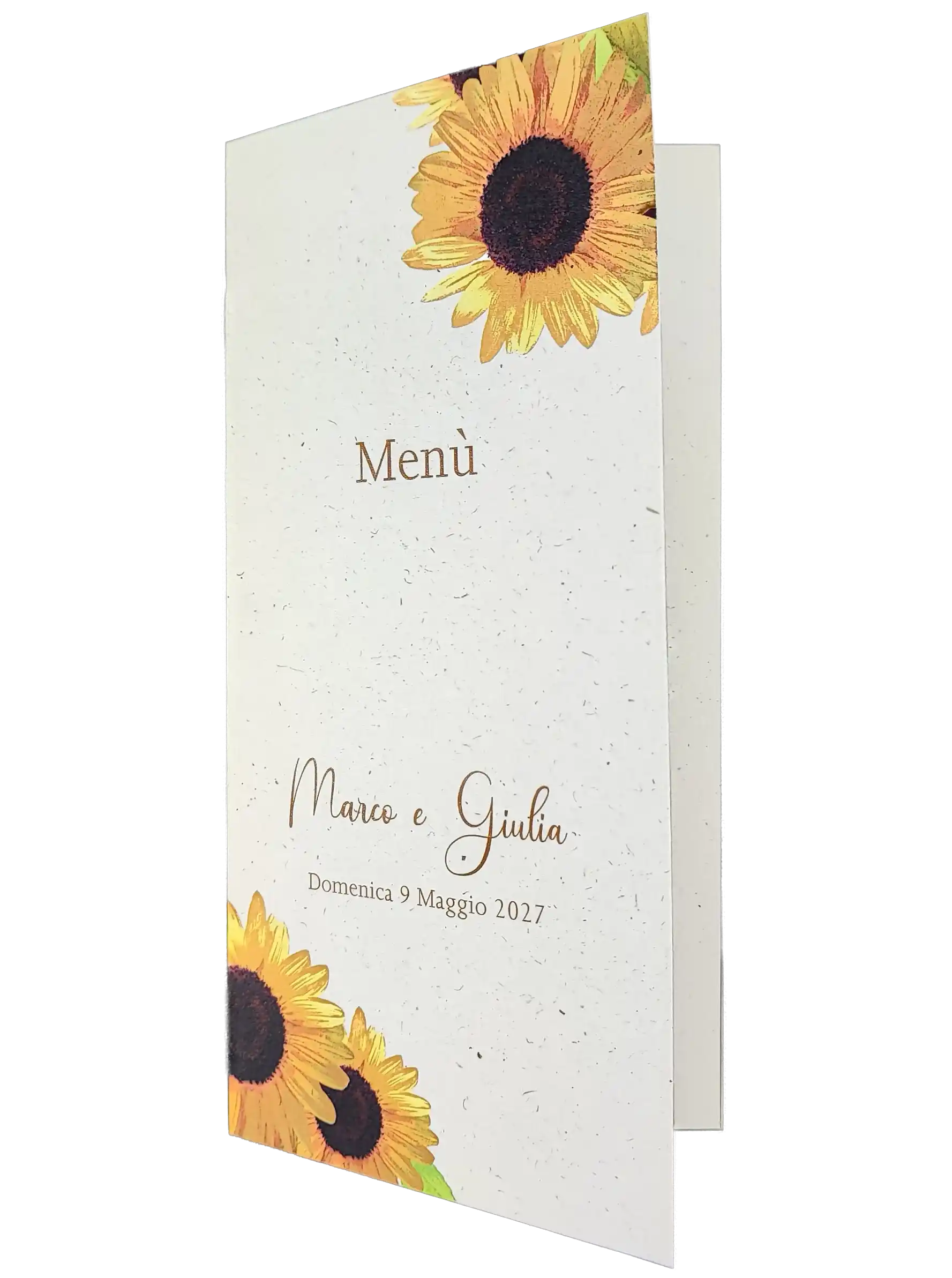 Realizzato in pregiata carta effetto riciclato da 240 gr, questo menù pieghevole è perfetto per chi desidera un’estetica gioiosa e allegra.