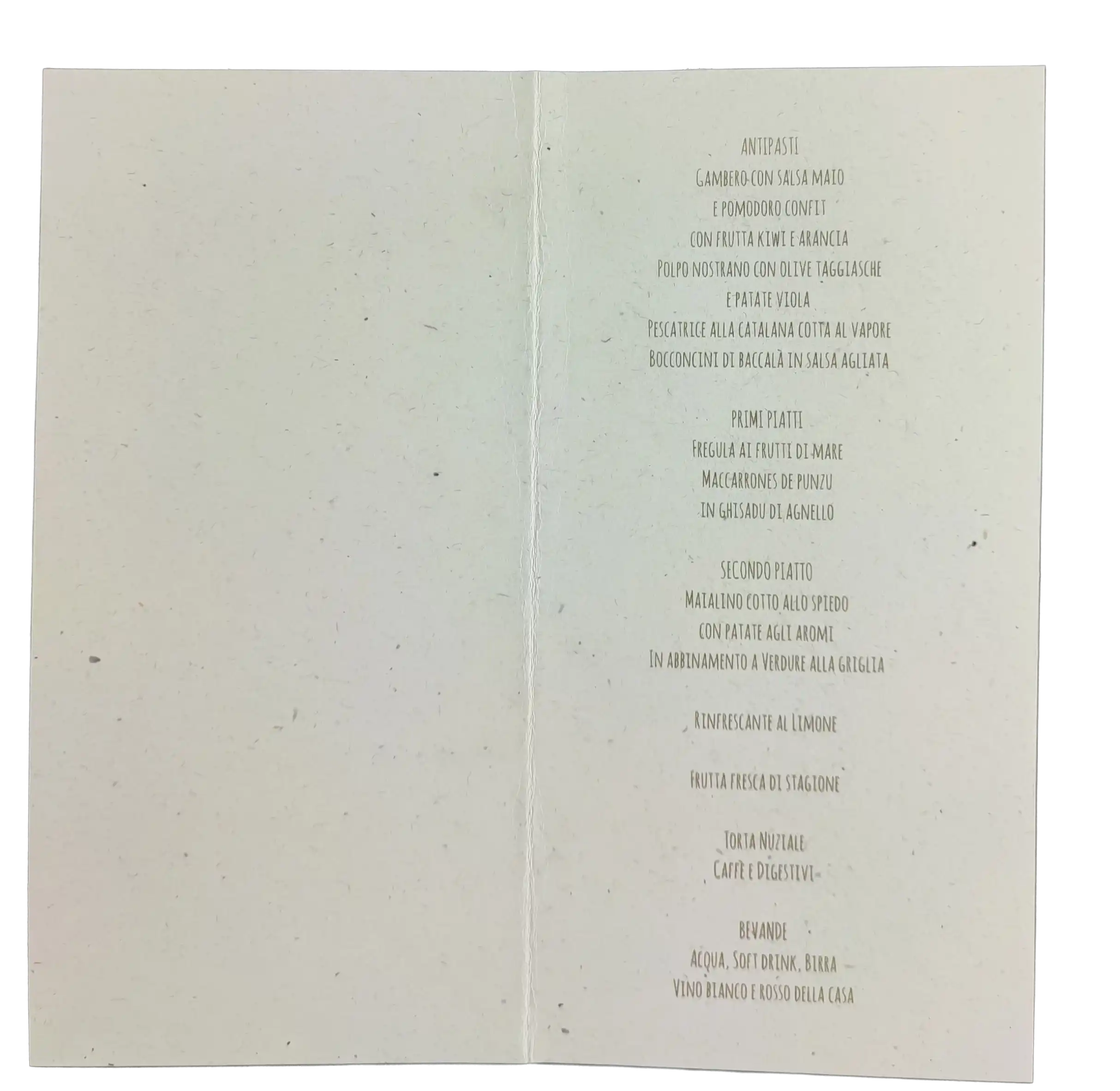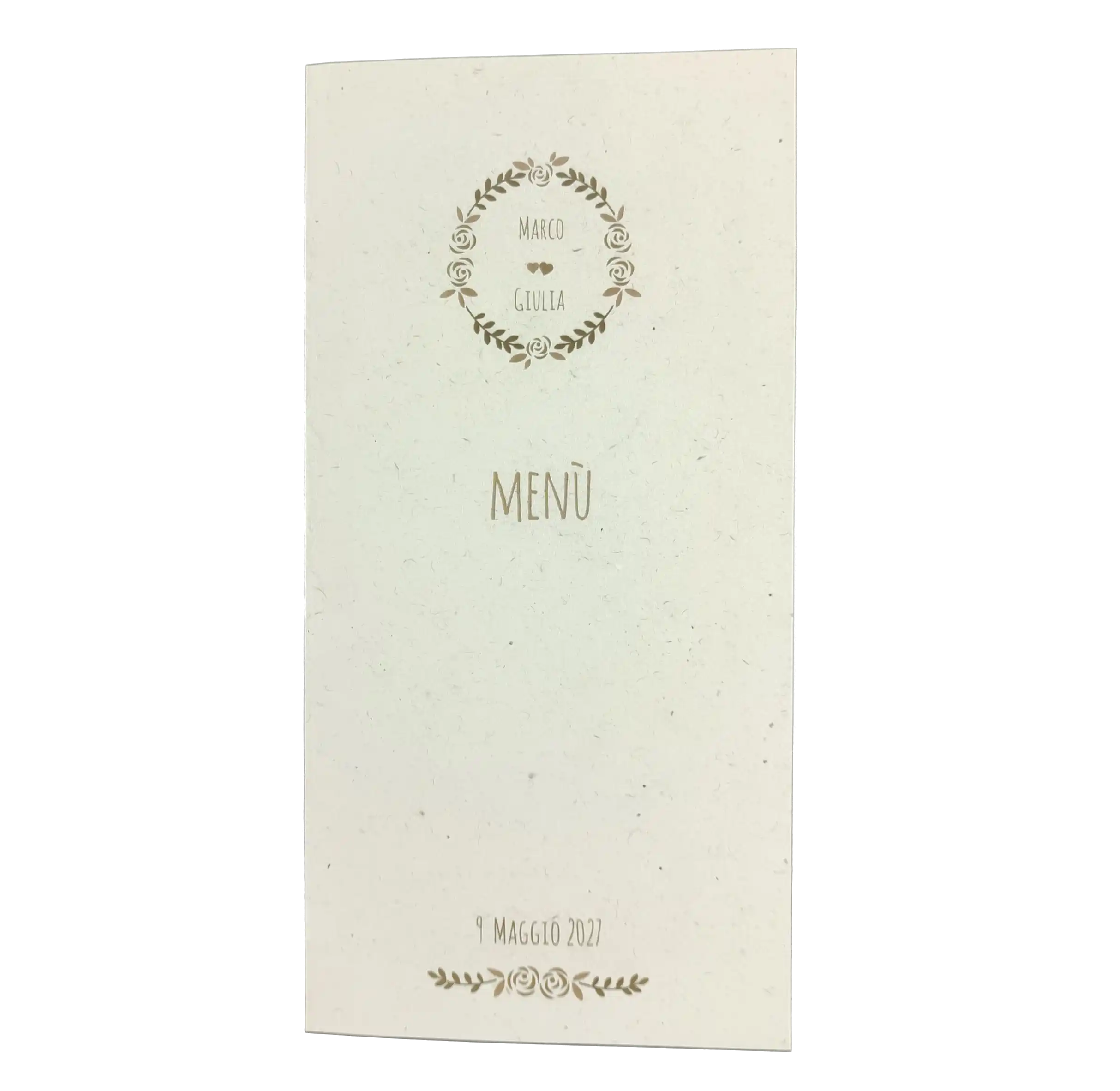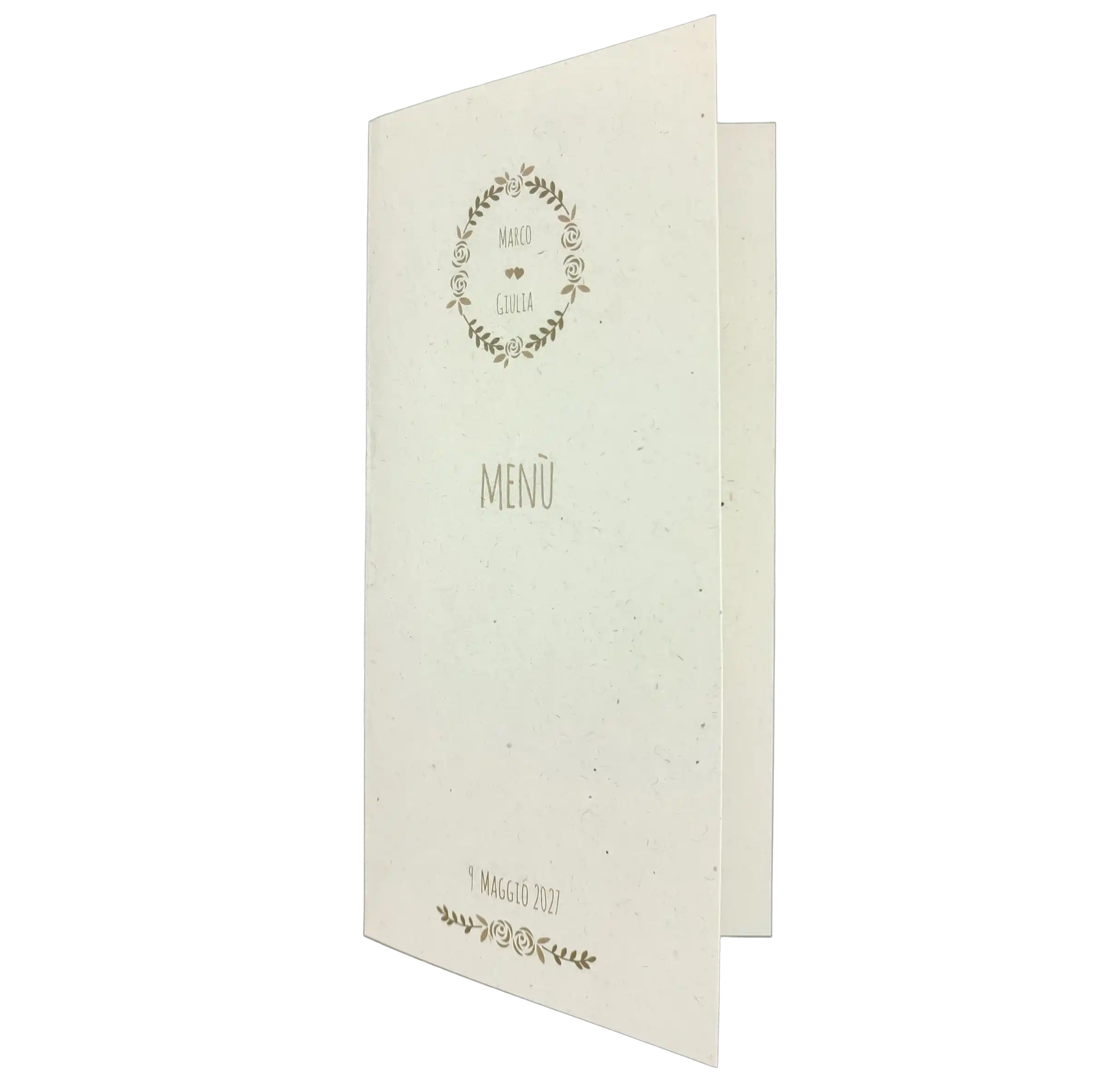 Realizzato in pregiata carta materica effetto riciclato da 240 gr, questo menù pieghevole è perfetto per un matrimonio dallo stile botanico, country-chic o minimalista naturale.