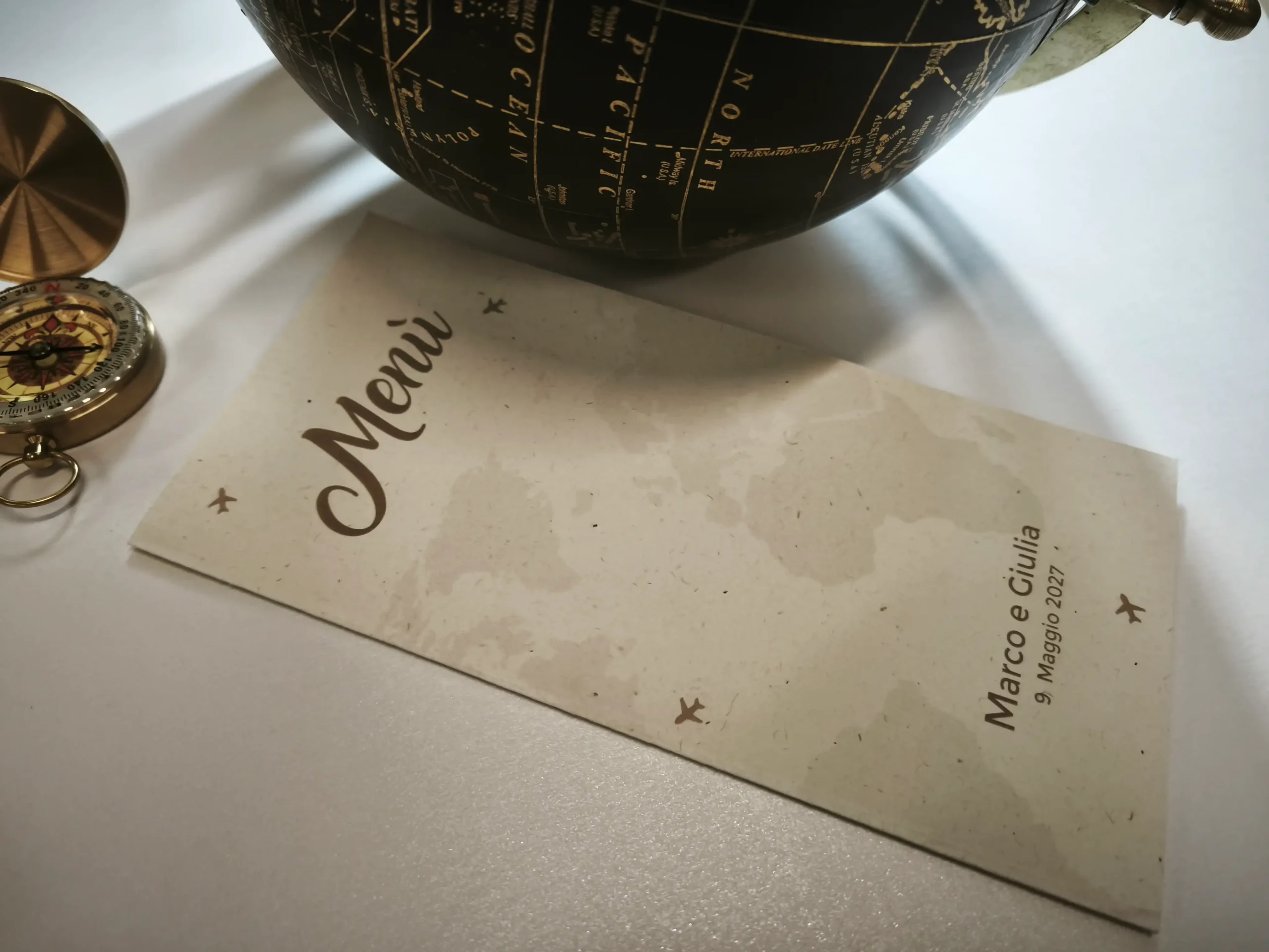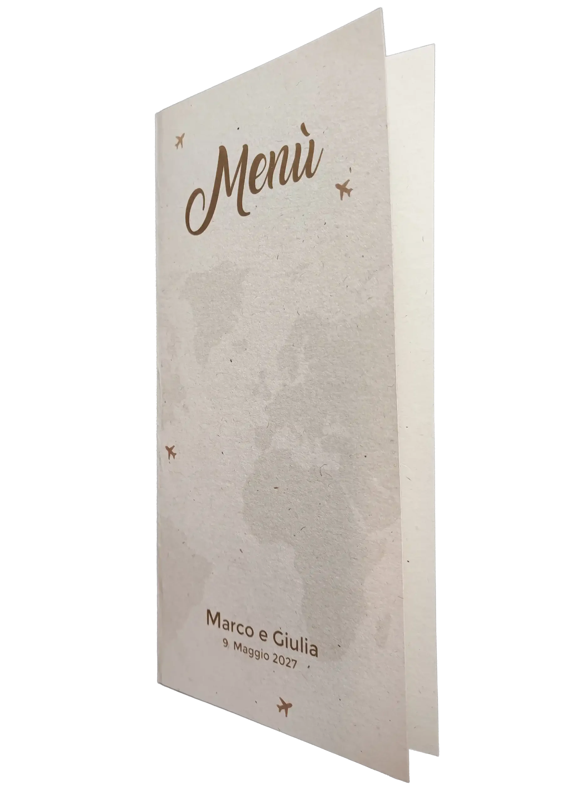 Realizzato in pregiata carta effetto riciclato color avorio da 260 gr, questo menù pieghevole è perfetto per chi desidera un’estetica simpatica e dinamica a tema viaggio.