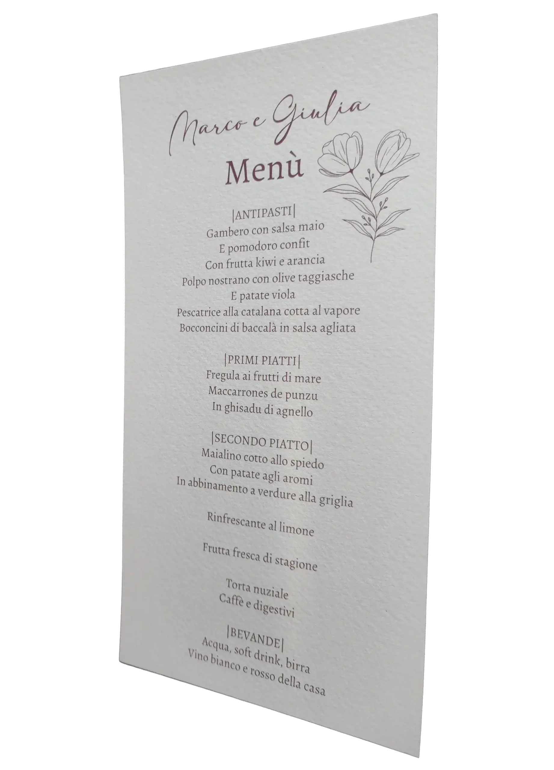 Essenziale, moderno e di grande impatto visivo: il menù singolo della linea “Rosa Minimal” è pensato per chi desidera un’eleganza sottile che non ingombra la tavola.