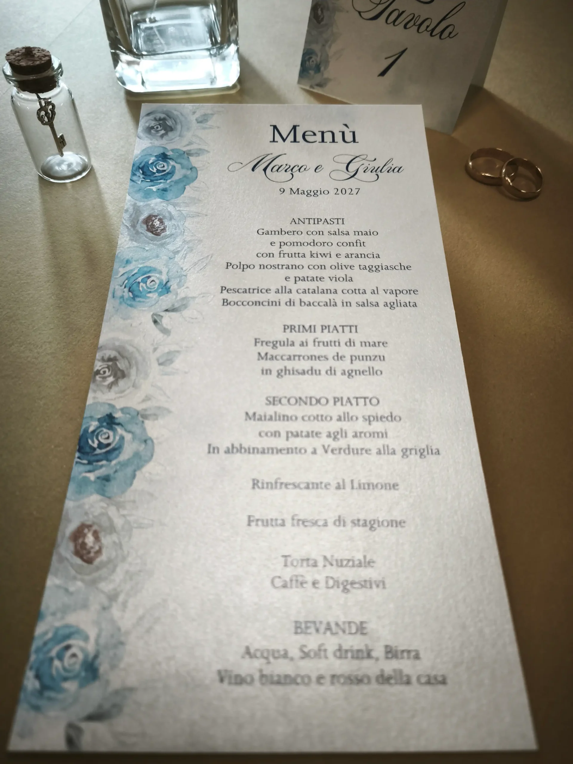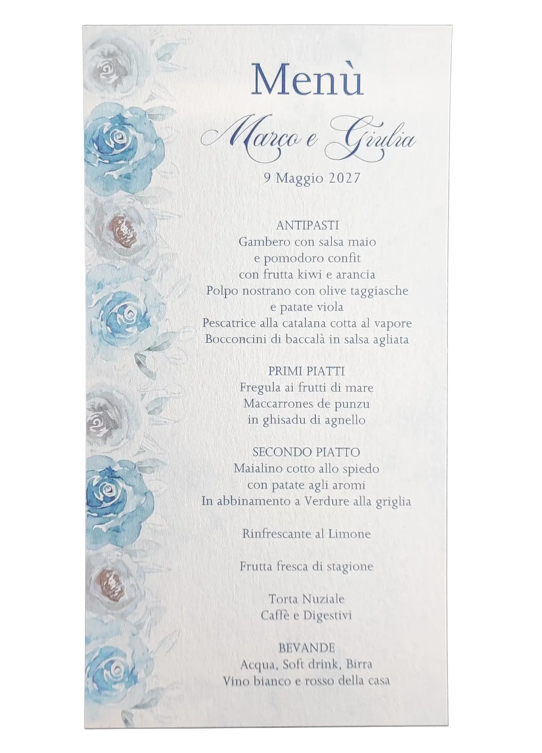La stampa è impreziosita da delicati acquerelli floreali nei toni dell’azzurro, che corrono lungo il profilo laterale, creando un richiamo visivo fresco e sofisticato. Con le sue dimensioni di 11×21 cm, questo menù si presenta come un elemento decorativo essenziale, perfetto per completare il “mise en place” di matrimoni dallo stile romantico, chic o a tema botanico.