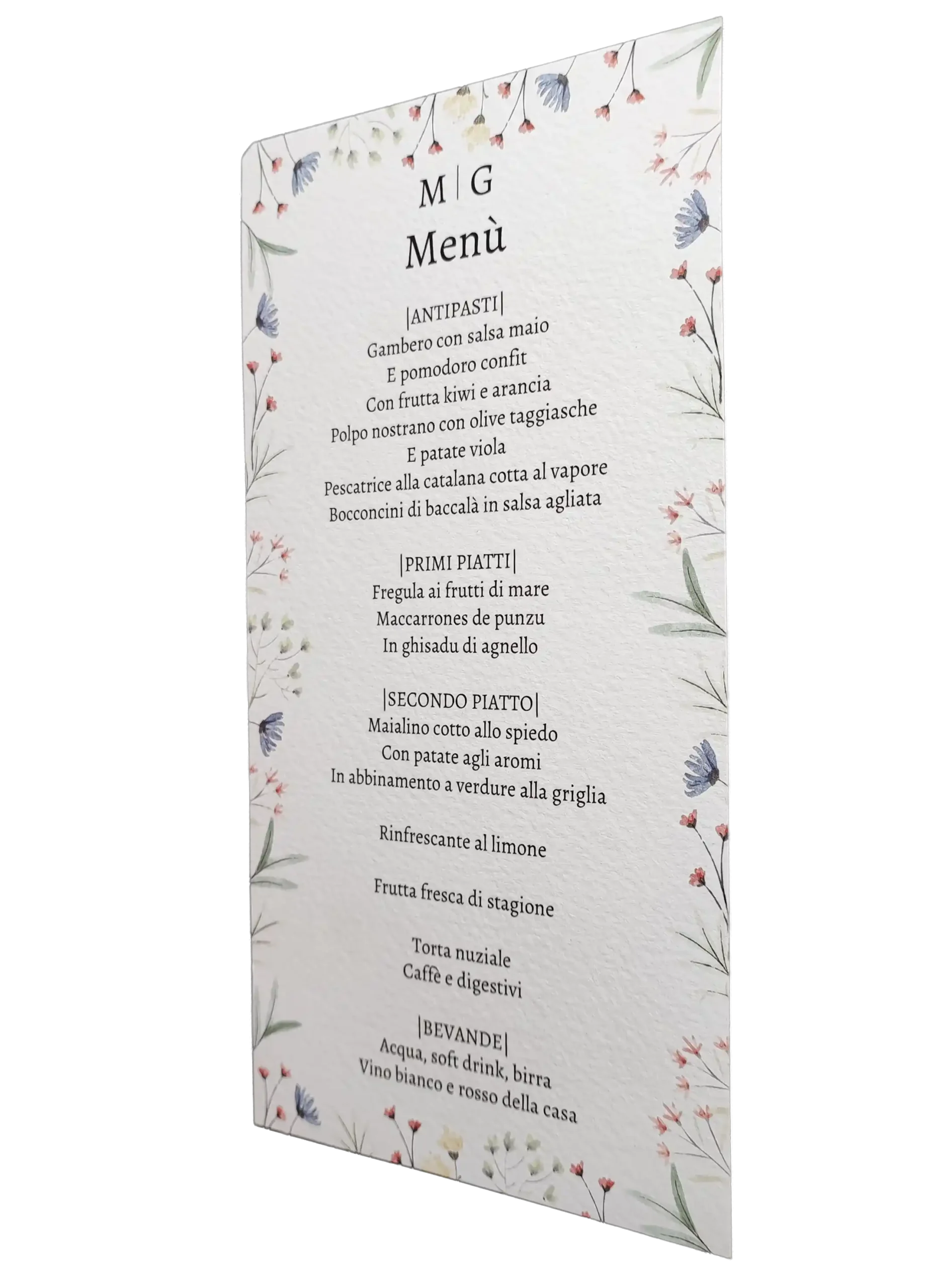Stampato su pregiato cartoncino martellato da 260 gr, questo elemento si distingue per la sua texture materica al tatto, impreziosita da una delicata cornice di fiori di campo e piccoli boccioli colorati che incorniciano il testo con estrema leggerezza.