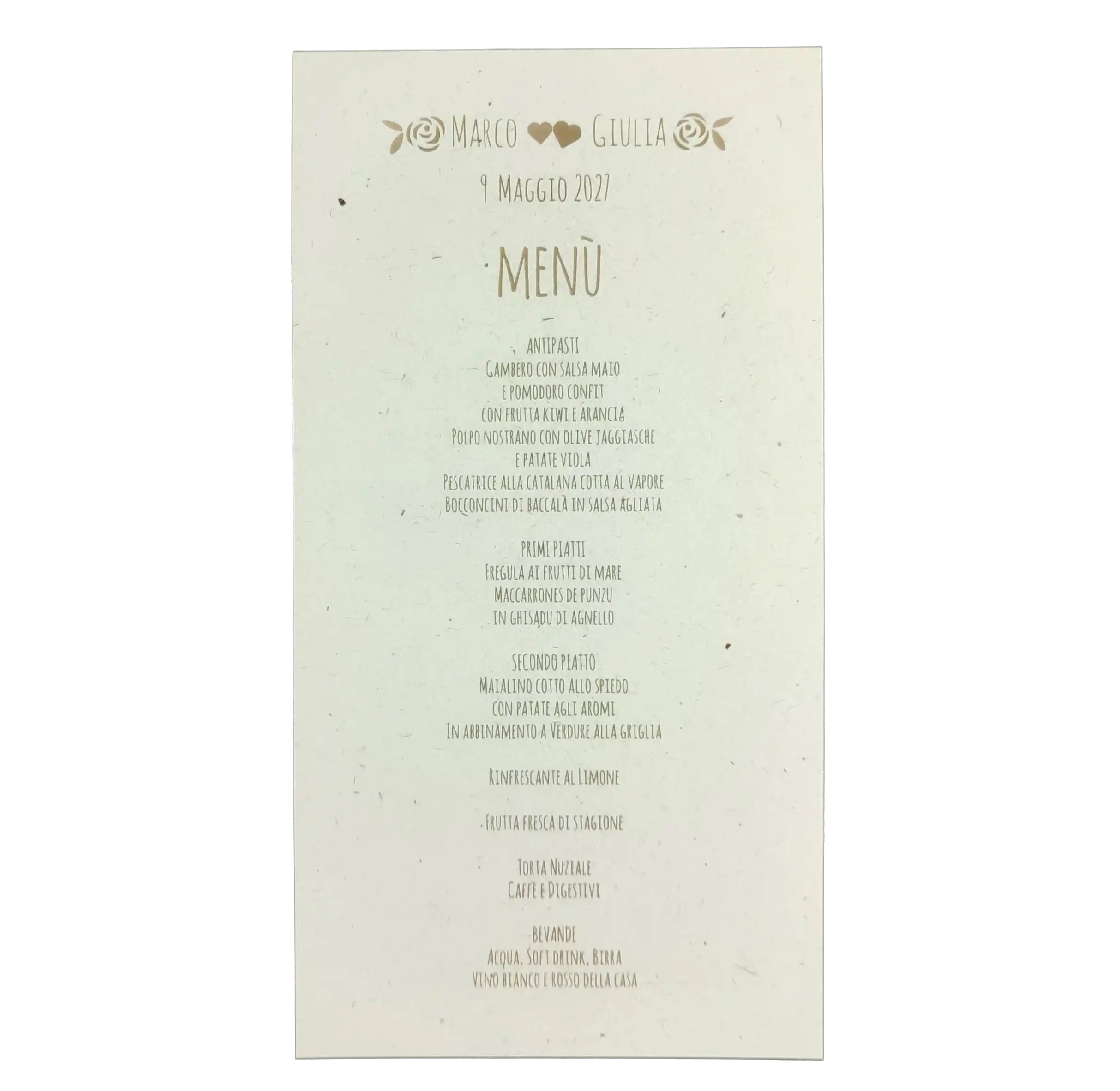 Stampato su pregiata carta materica effetto riciclato da 240 gr, questo menù singolo è perfetto per un matrimonio dallo stile botanico, country-chic o minimalista naturale.