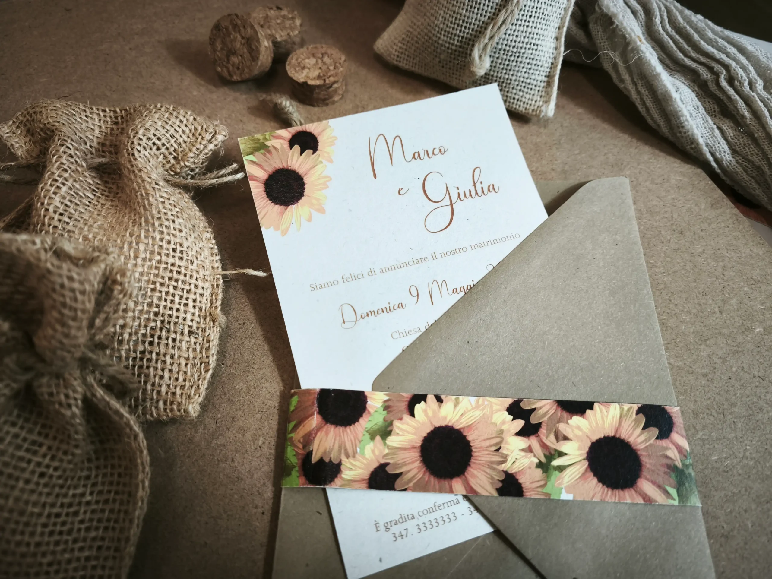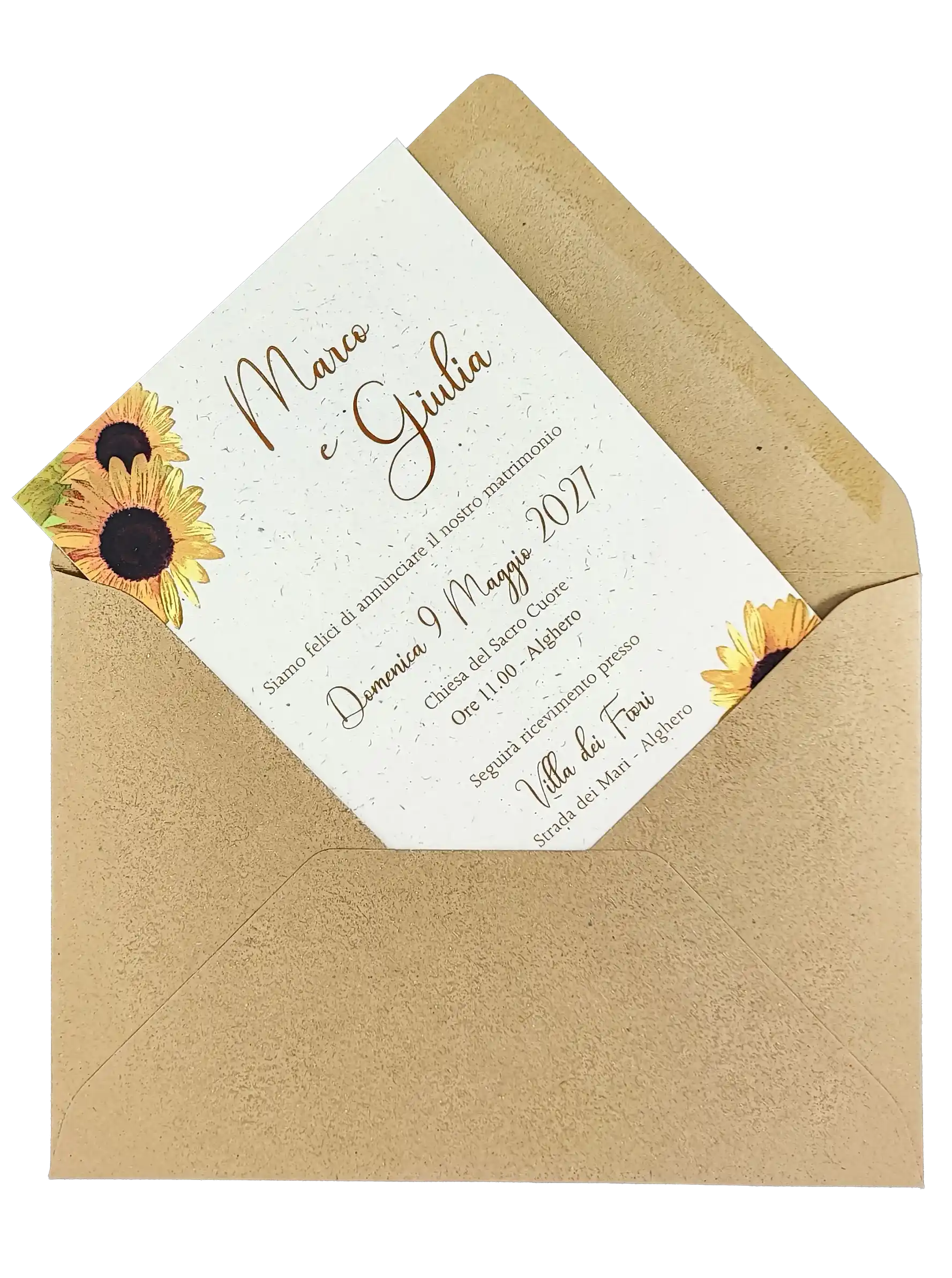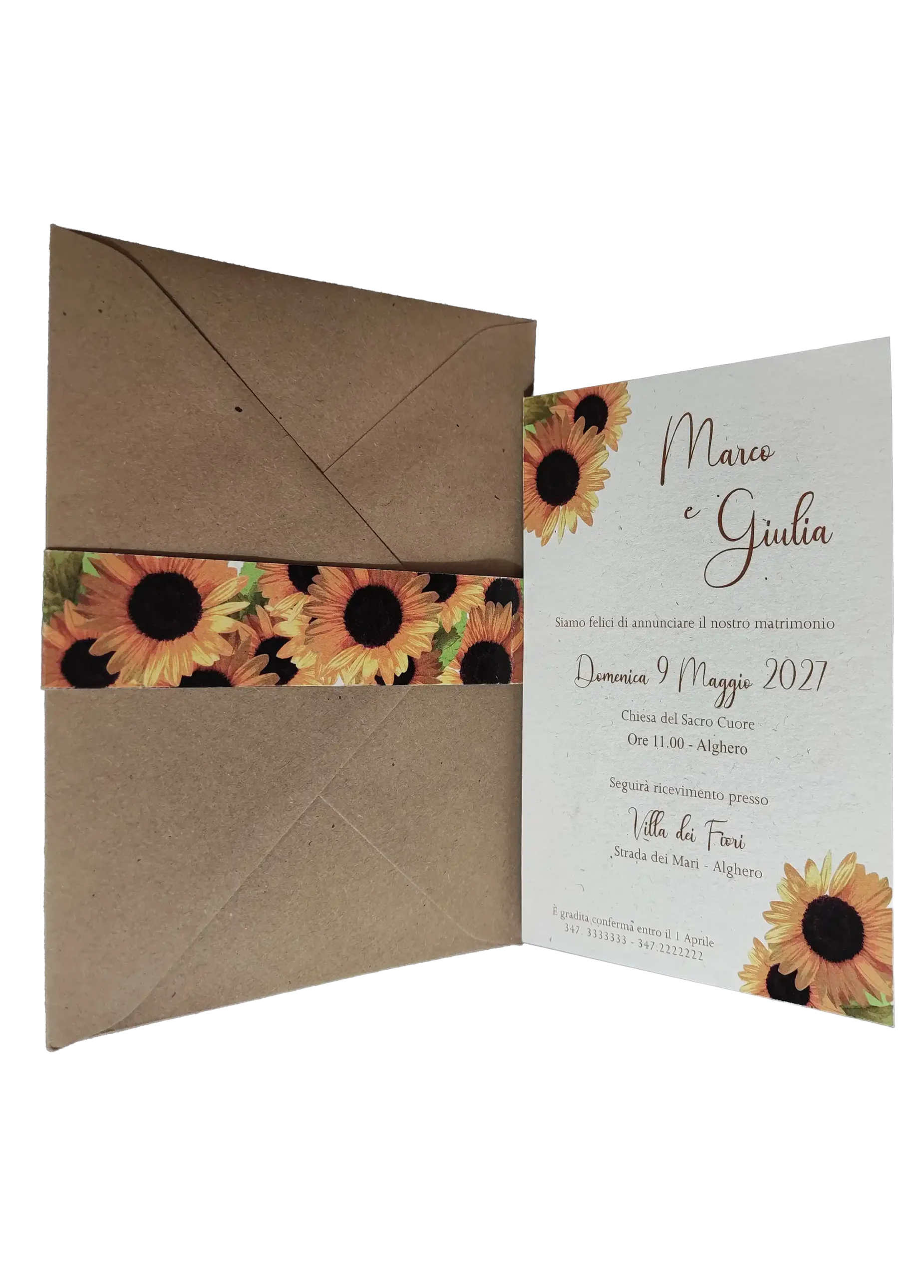 La busta con taglio a punta aggiunge una nota di delicatezza, creando un contrasto armonioso che esalta la pulizia del design grafico e dei tratti floreali dei girasoli.