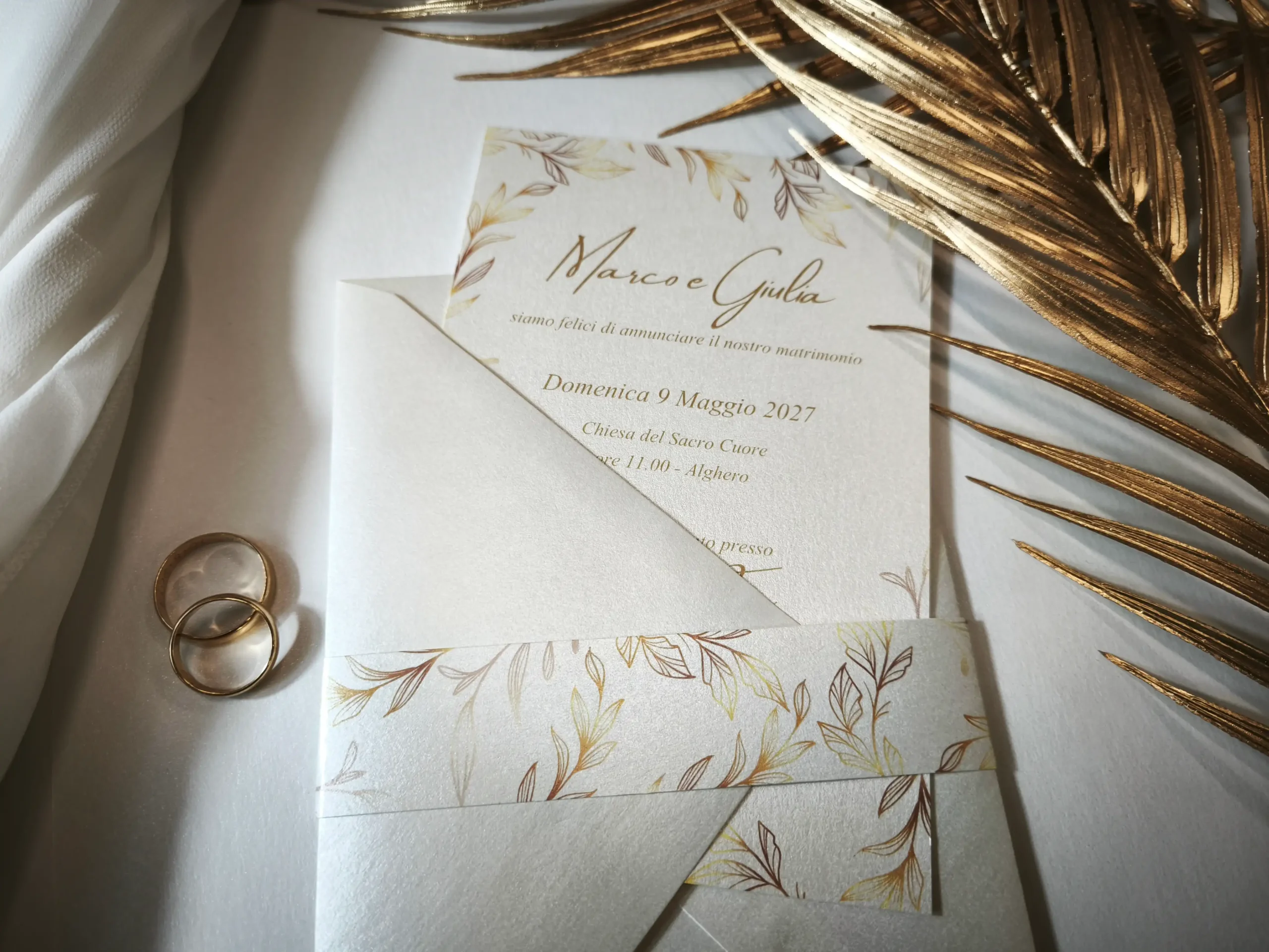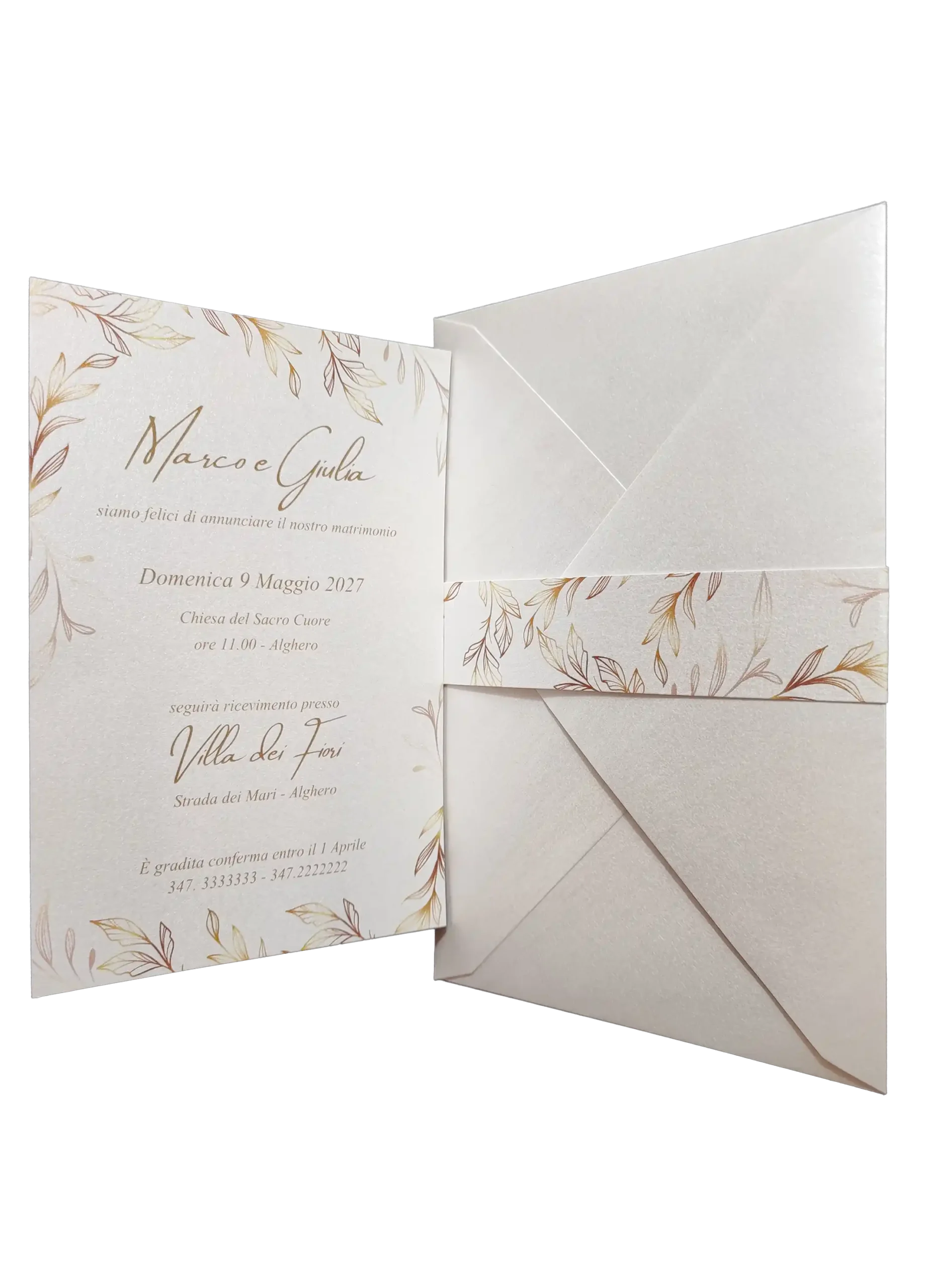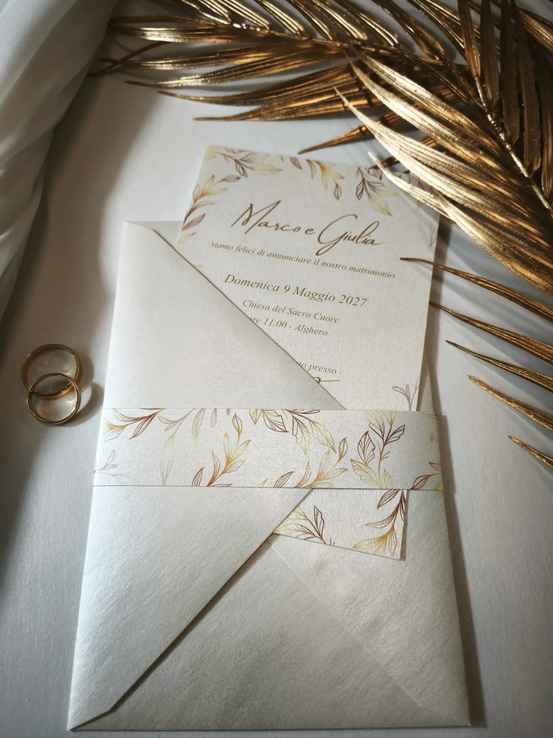 Realizzata in pregiata carta perlata color avorio da 240 gr, questa partecipazione si distingue per la sua texture materica che dona un carattere elegante e raffinato.