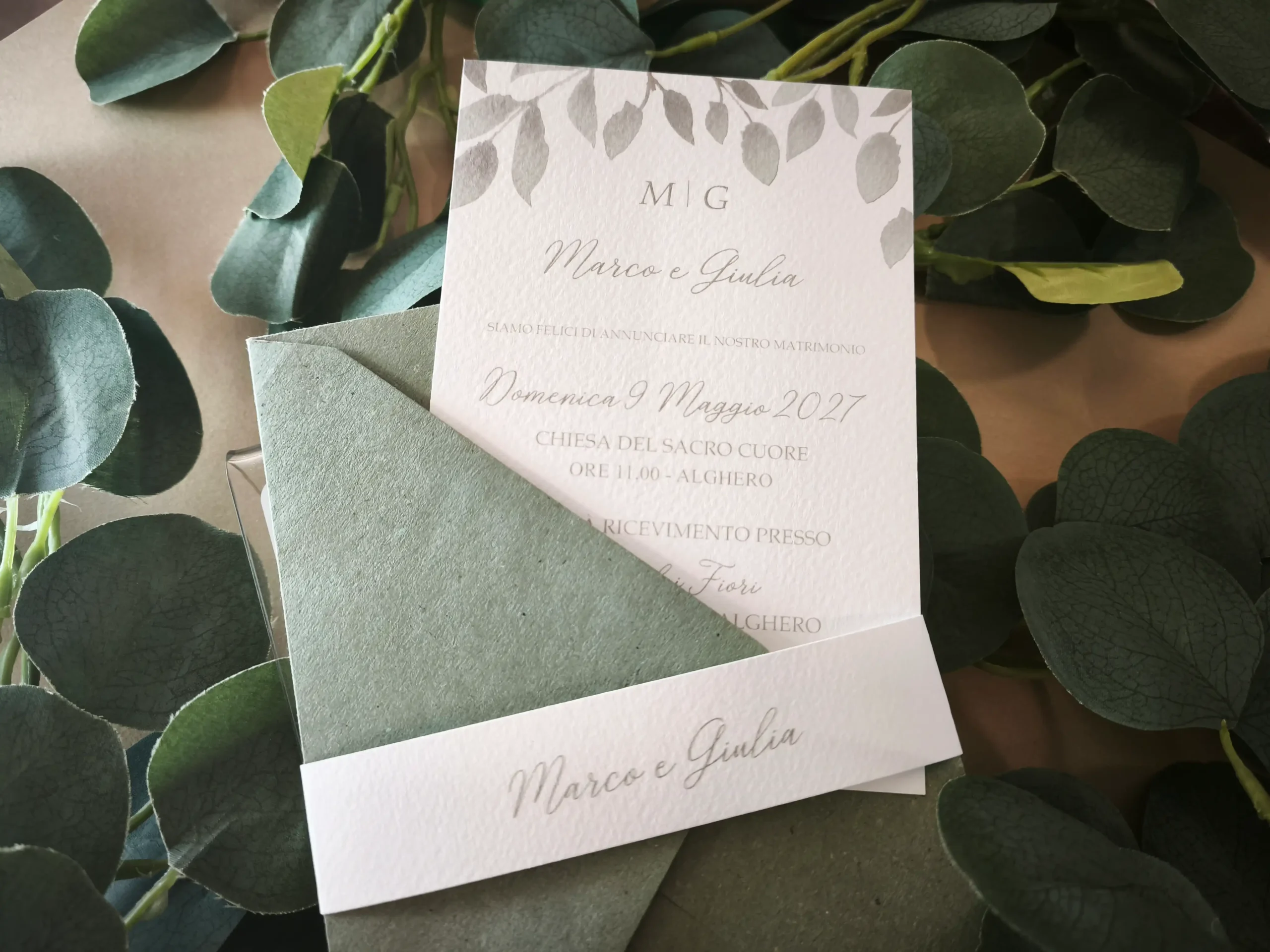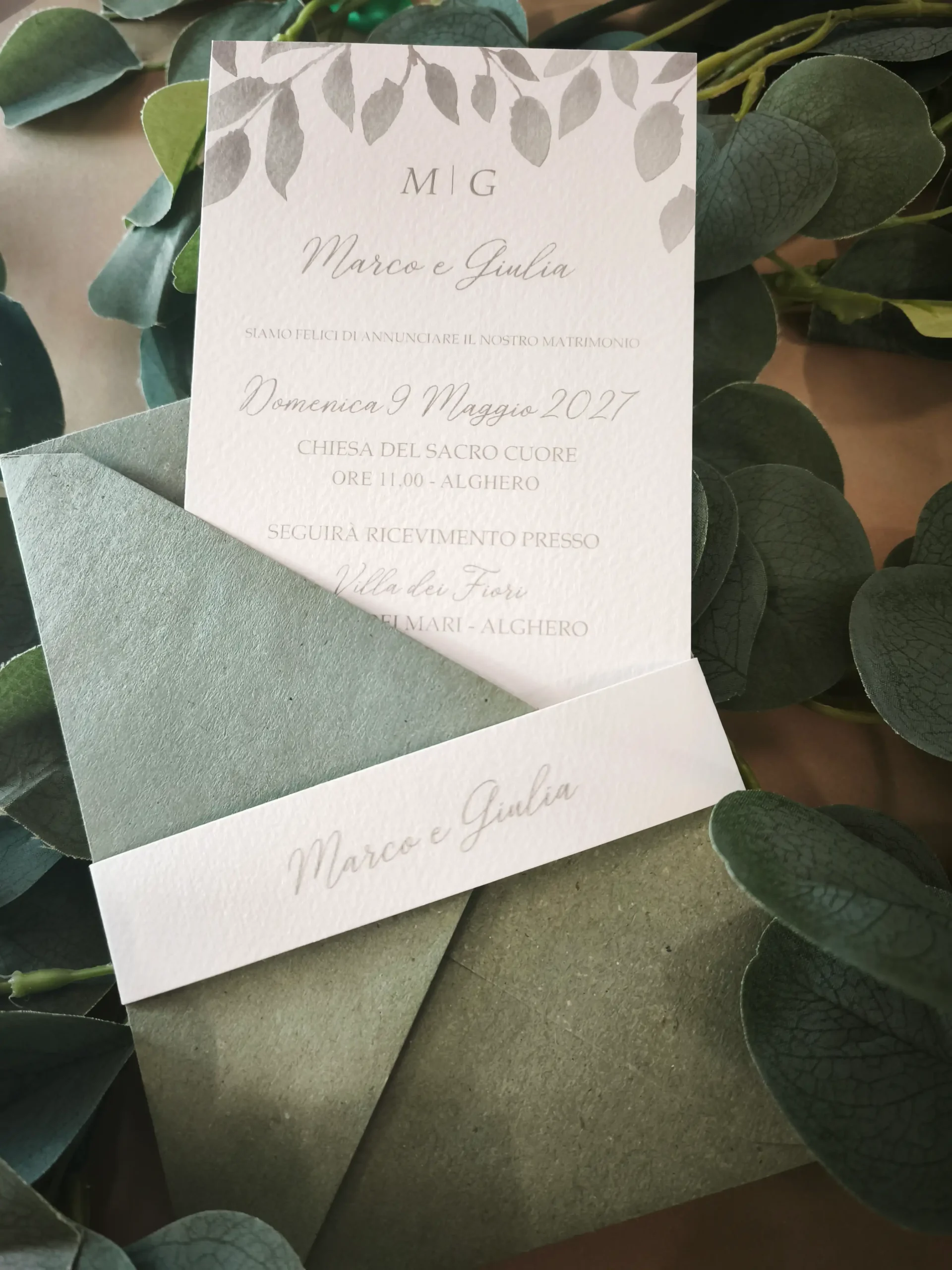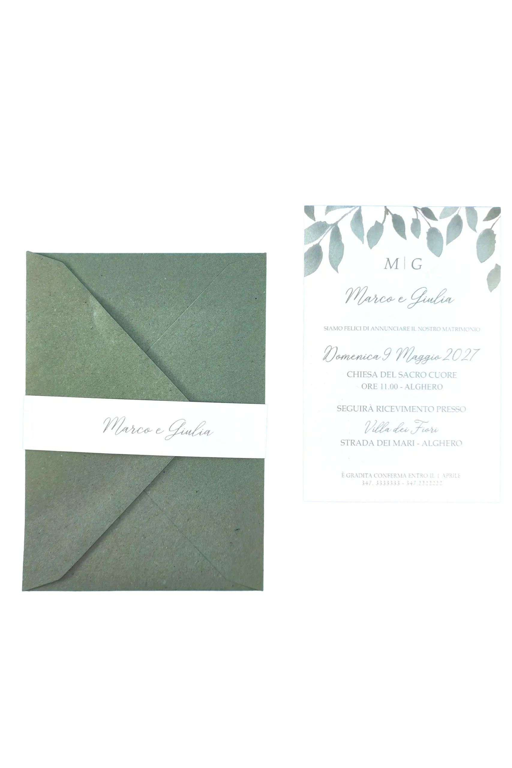 Perfetta per un matrimonio dallo stile elegante, sofisticato o a tema botanico, questa partecipazione può essere ulteriormente impreziosita da una fascia abbinata da 3,5 cm, un dettaglio di stile che racchiude l’invito con estrema eleganza.