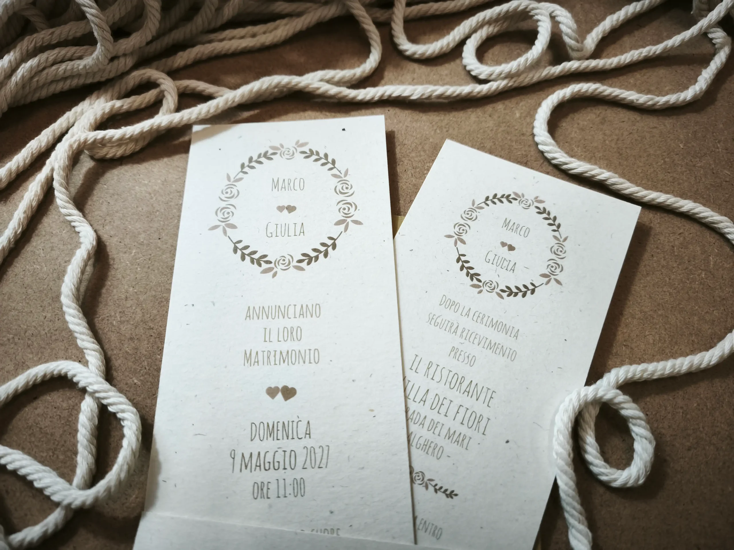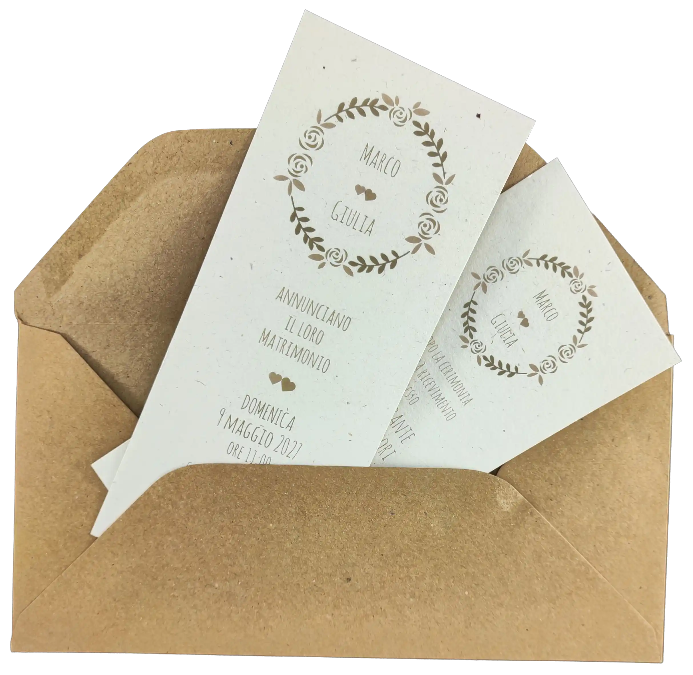 Realizzata in carta effetto riciclato da 240 gr, questa partecipazione si distingue per la sua superficie naturale, punteggiata da leggere fibre a vista che conferiscono un carattere eco-chic e artigianale.