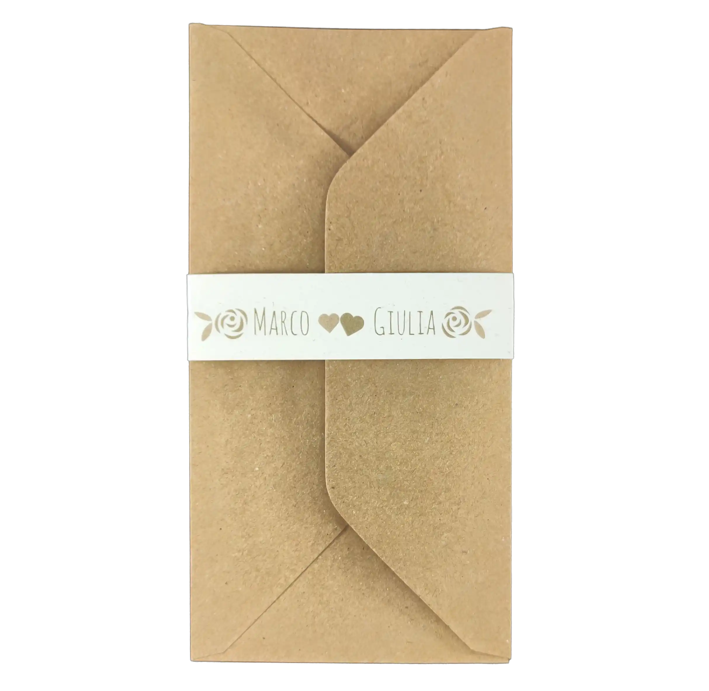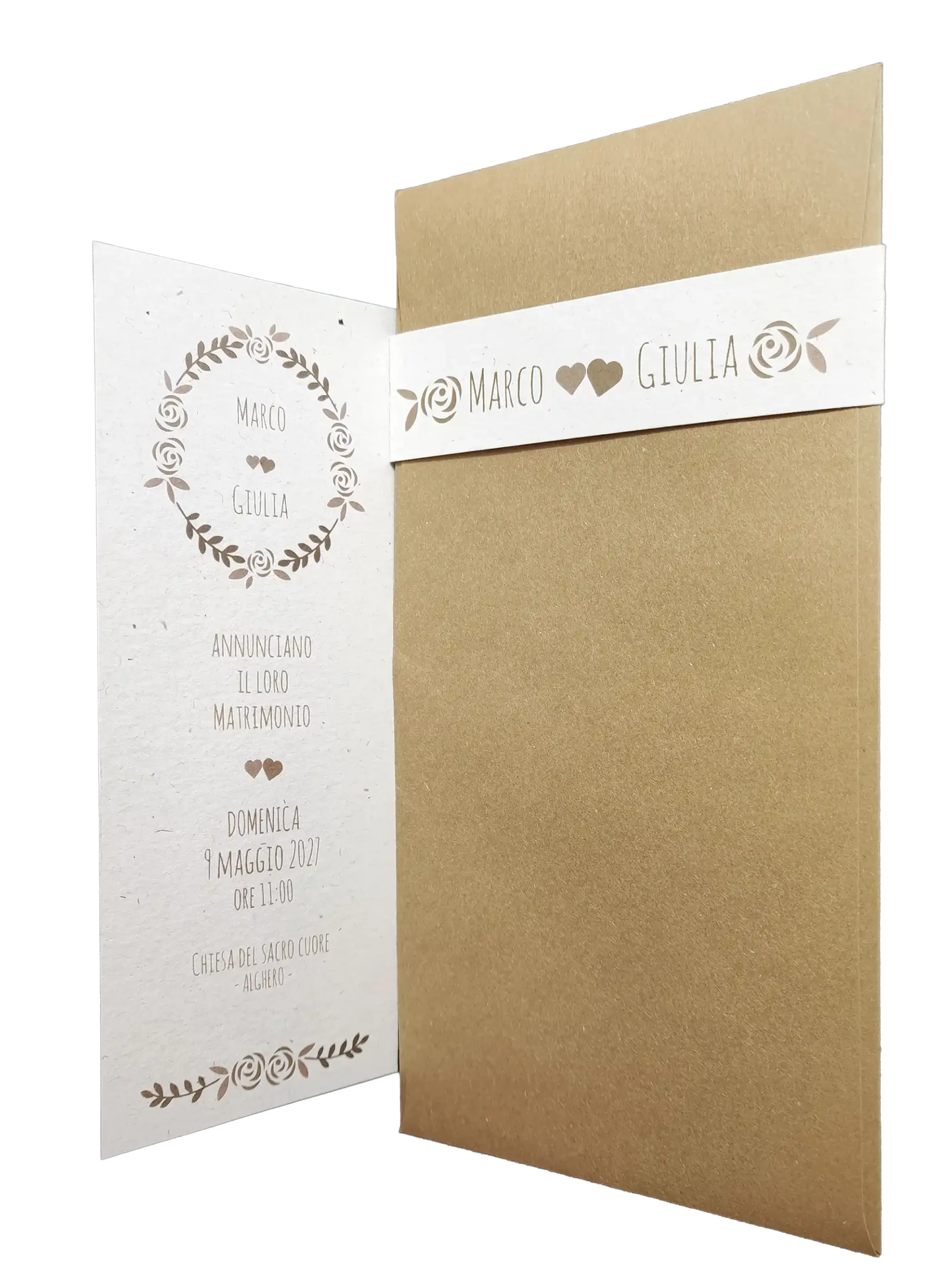 Perfetta per un matrimonio dallo stile botanico, country-chic o minimalista naturale, questa partecipazione può essere ulteriormente personalizzata con una fascia chiudibusta abbinata.