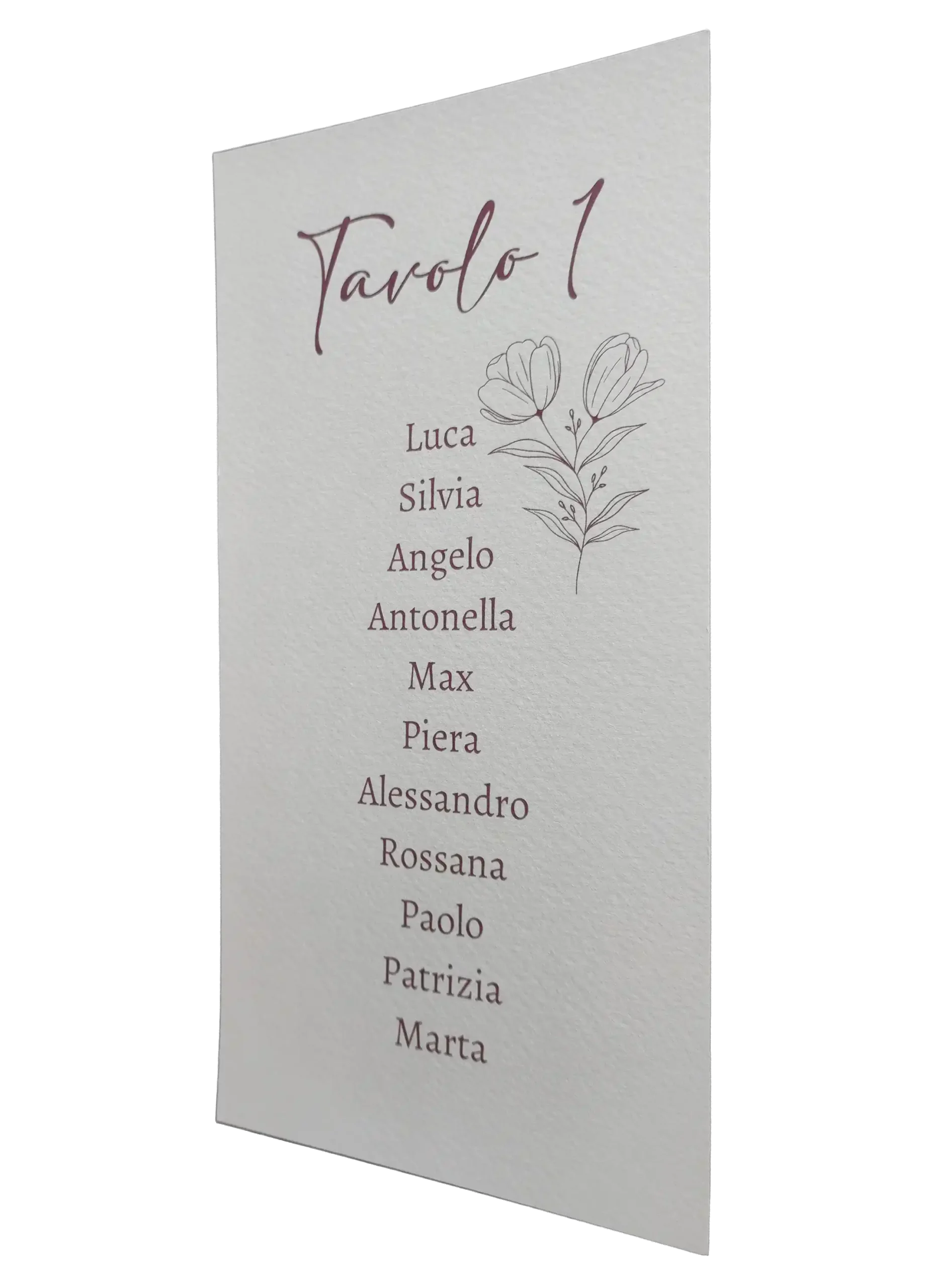 Il design presenta l’intestazione del tavolo in un font calligrafico, accompagnato da un’illustrazione floreale a linee sottili che caratterizza l’intera collezione. La spaziatura è studiata per ospitare l’elenco dei vostri ospiti con la massima leggibilità, mantenendo un aspetto pulito e sofisticato. Grazie al suo formato versatile, può essere facilmente appeso a cornici, applicato su basi materiche o inserito in supporti trasparenti.