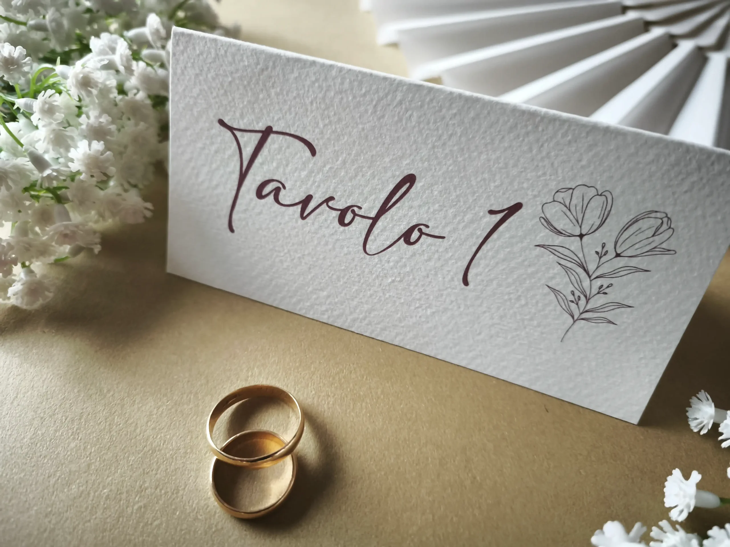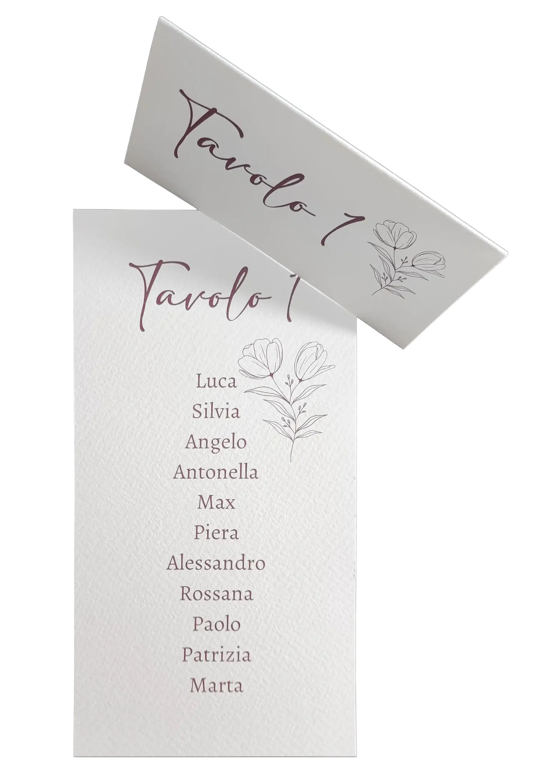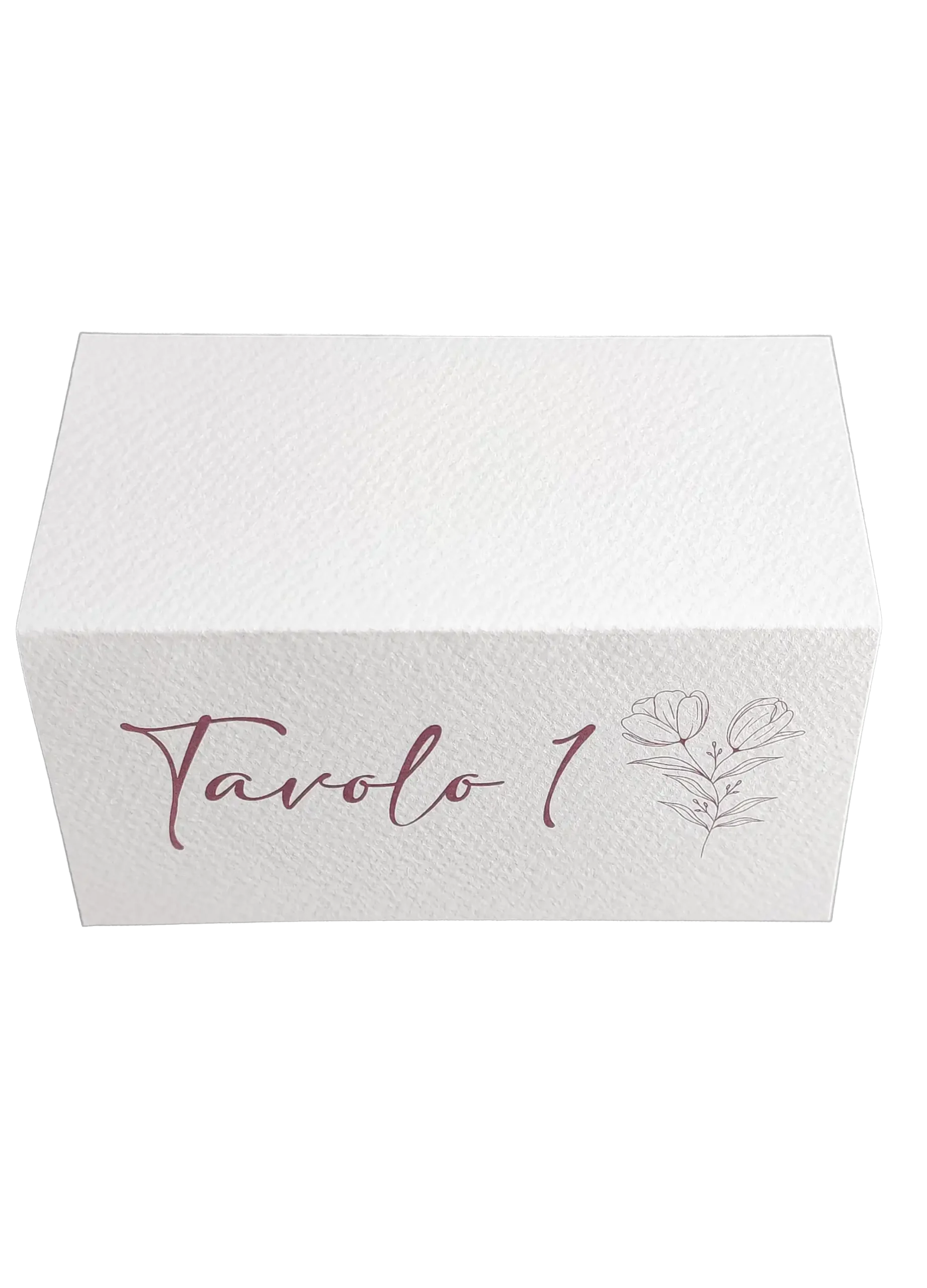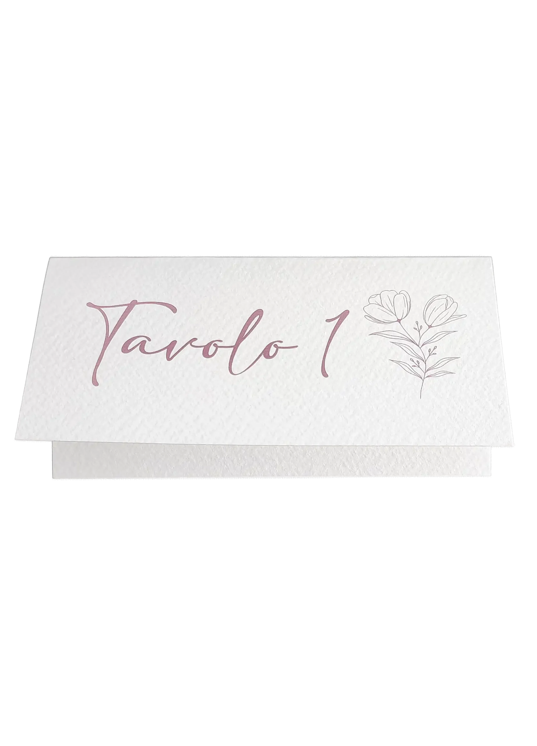 La struttura a tendina è studiata per offrire massima stabilità e visibilità: da un lato il numero o il nome del tavolo risalta grazie alla texture materica della carta, dall’altro la delicatezza del tratto floreale completa l’allestimento con discrezione e raffinatezza. Grazie alla grammatura sostenuta, il segnatavolo mantiene la sua forma in modo impeccabile per tutta la durata dell’evento.
