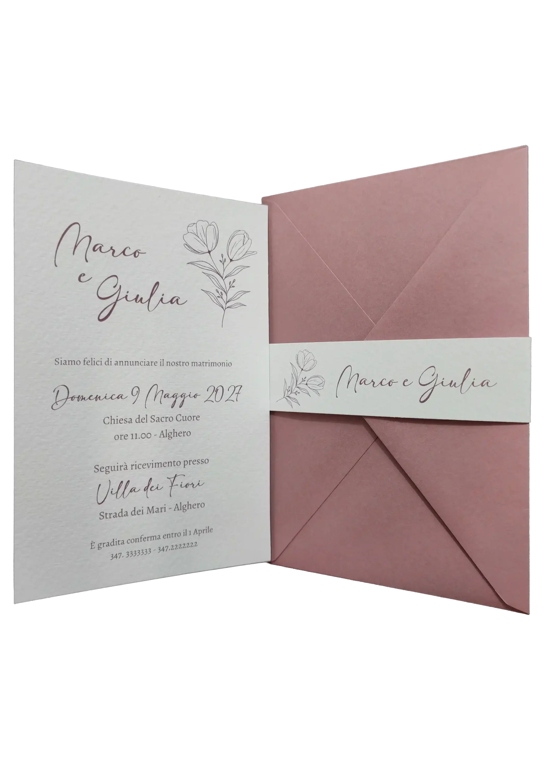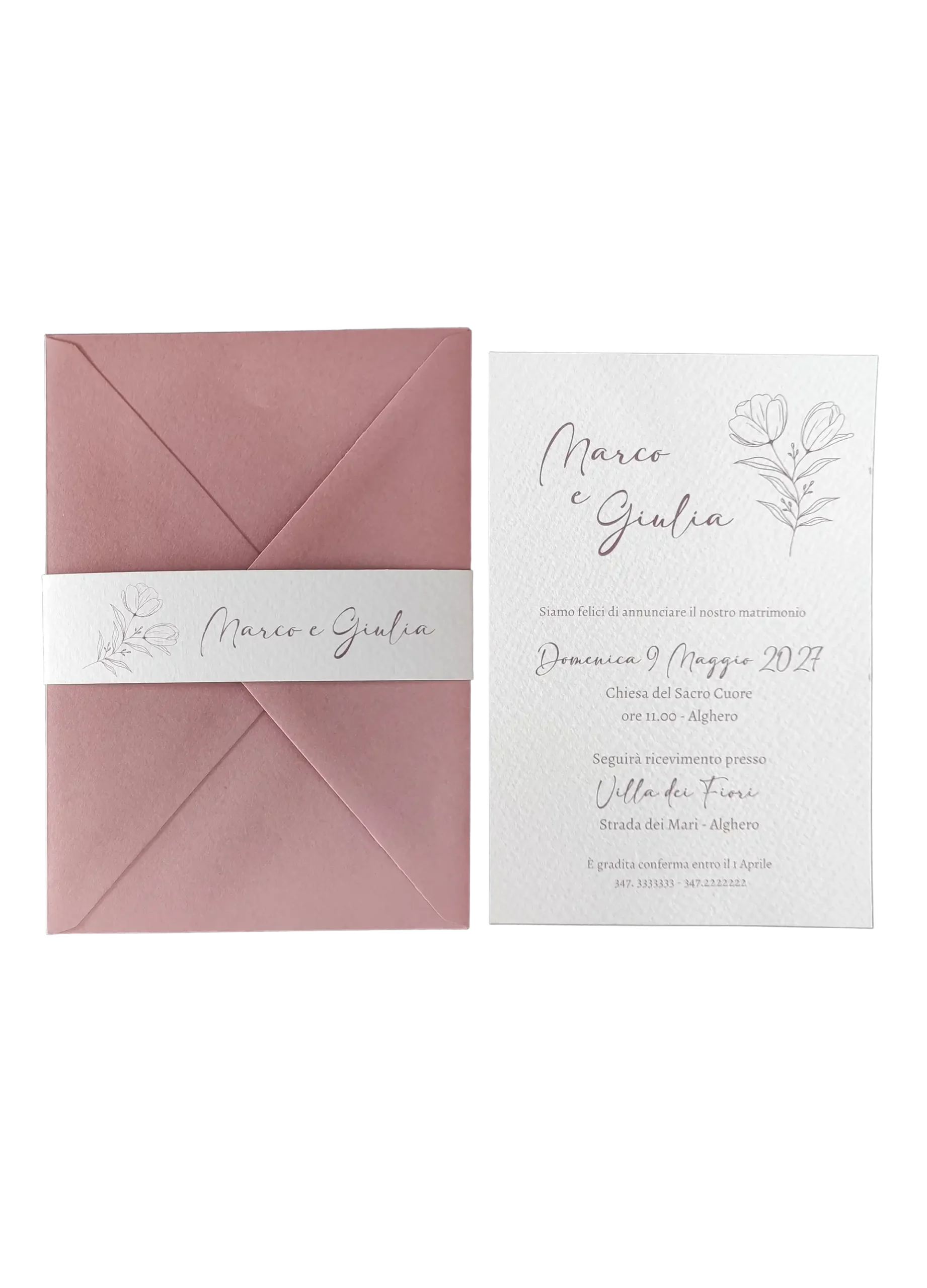 Perfetta per un matrimonio dallo stile elegante e a tema rose, questa partecipazione può essere ulteriormente personalizzata con una fascia abbinata per un dettaglio di stile in più.