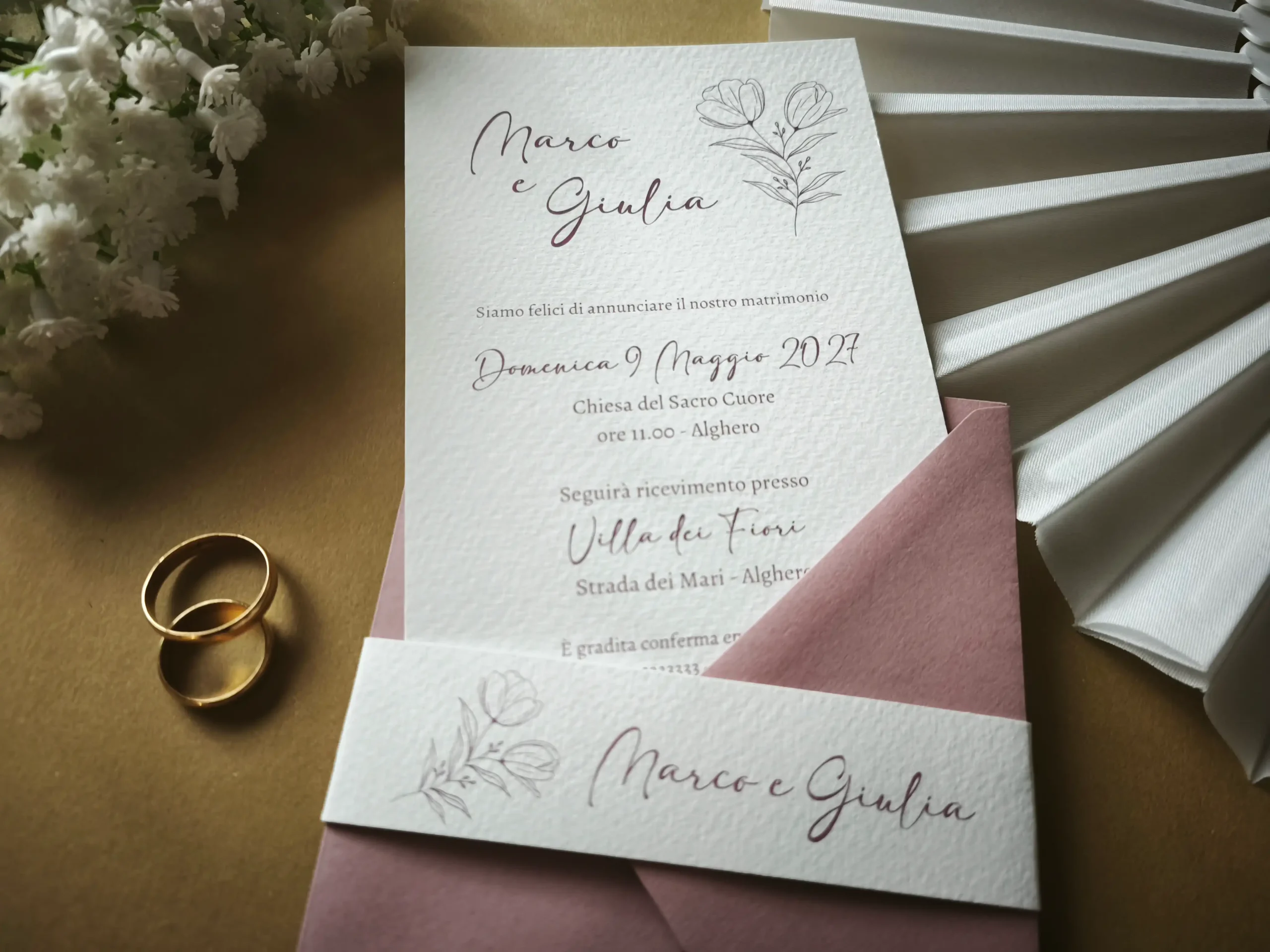 Realizzata in pregiato cartoncino Stardream Quartz, questa elegante partecipazione cattura la luce con riflessi delicati. La busta bordeaux aggiunge un tocco di raffinatezza, creando un contrasto che esalta la preziosità del cartoncino.