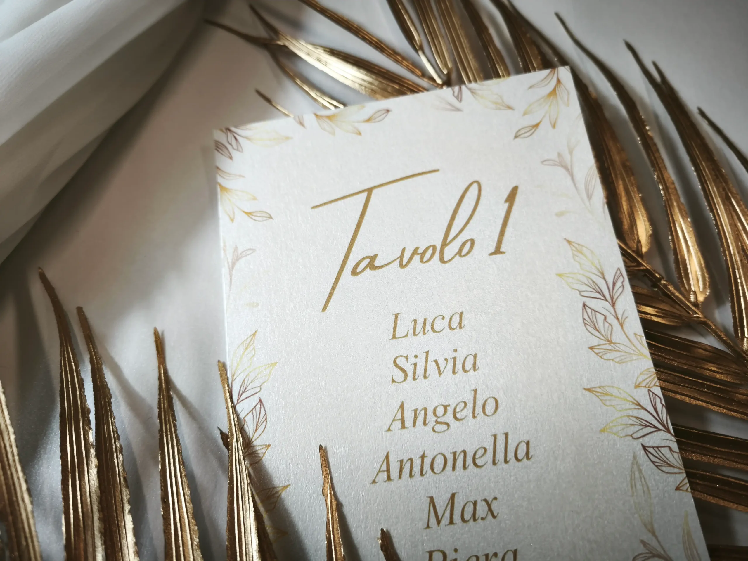 Realizzato in pregiata carta perlata avorio da 240 gr, questo cartoncino unisce la solidità di un supporto di qualità alla delicatezza estetica del tema oro.