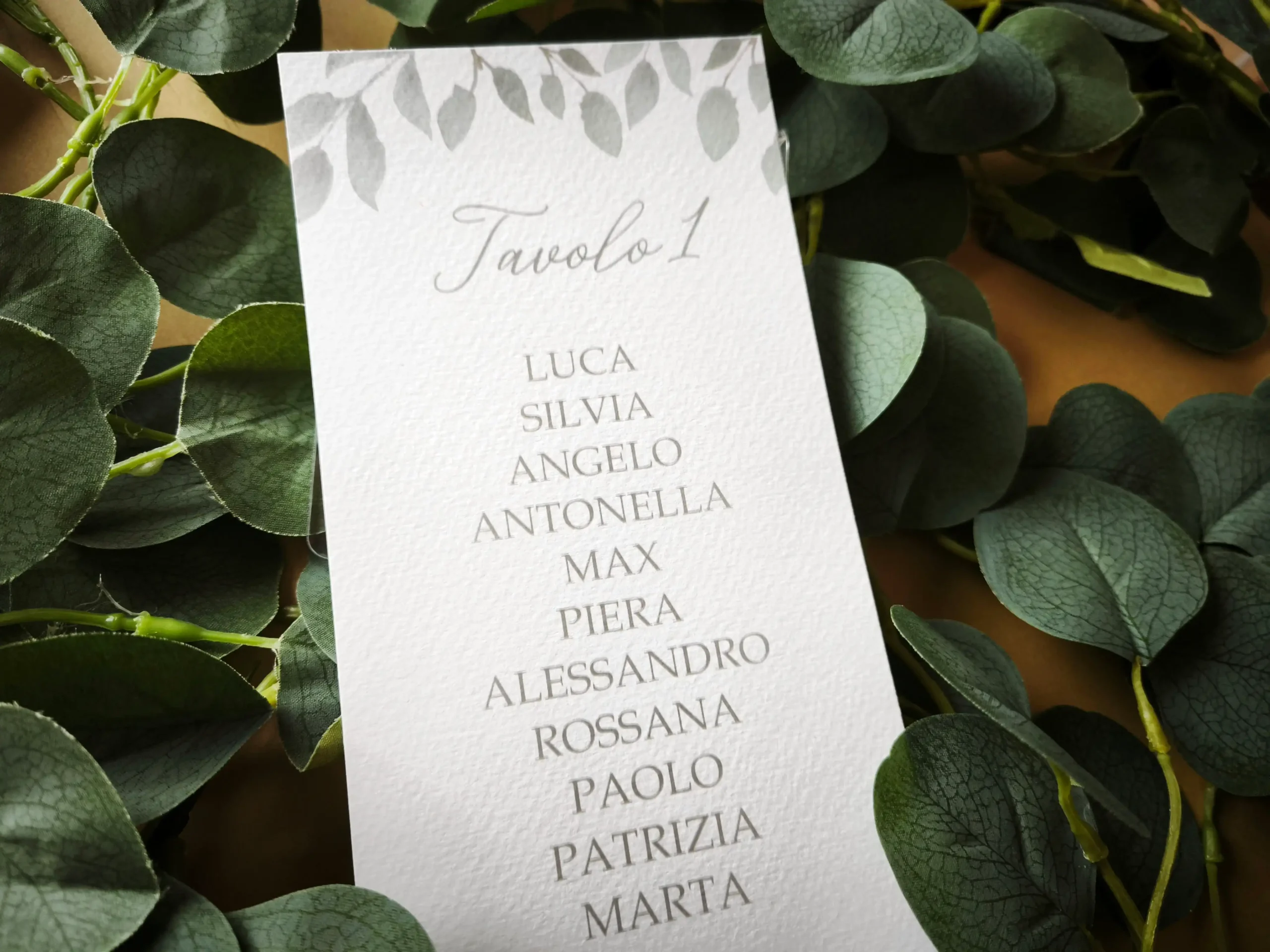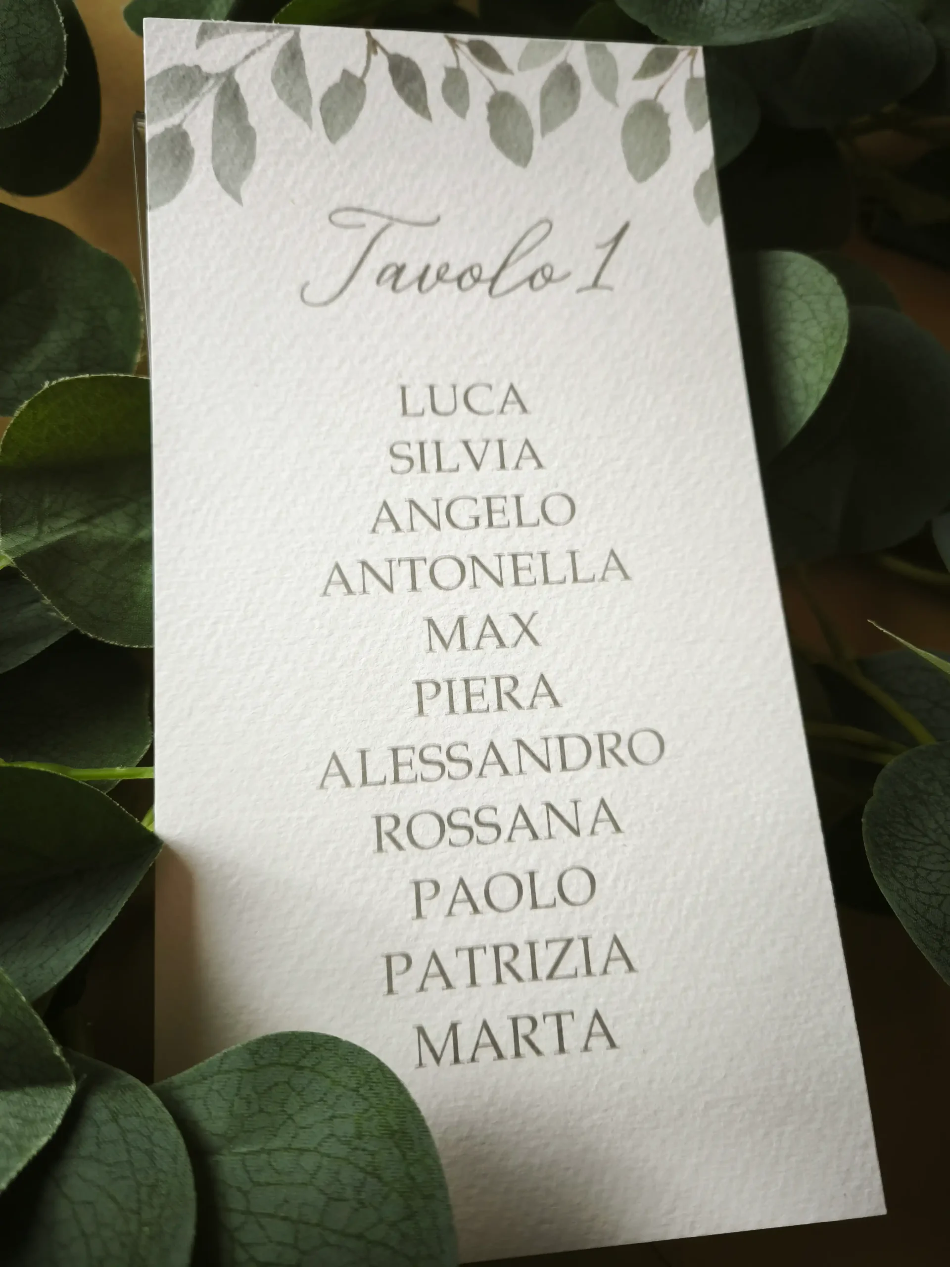 Il design presenta l’intestazione del tavolo in un font calligrafico, accompagnato da un’illustrazione con le foglie di salvia che caratterizza l’intera collezione. La spaziatura è studiata per ospitare l’elenco dei vostri ospiti con la massima leggibilità, mantenendo un aspetto pulito e sofisticato. Grazie al suo formato versatile, può essere facilmente appeso a cornici, applicato su basi materiche o inserito in supporti trasparenti.