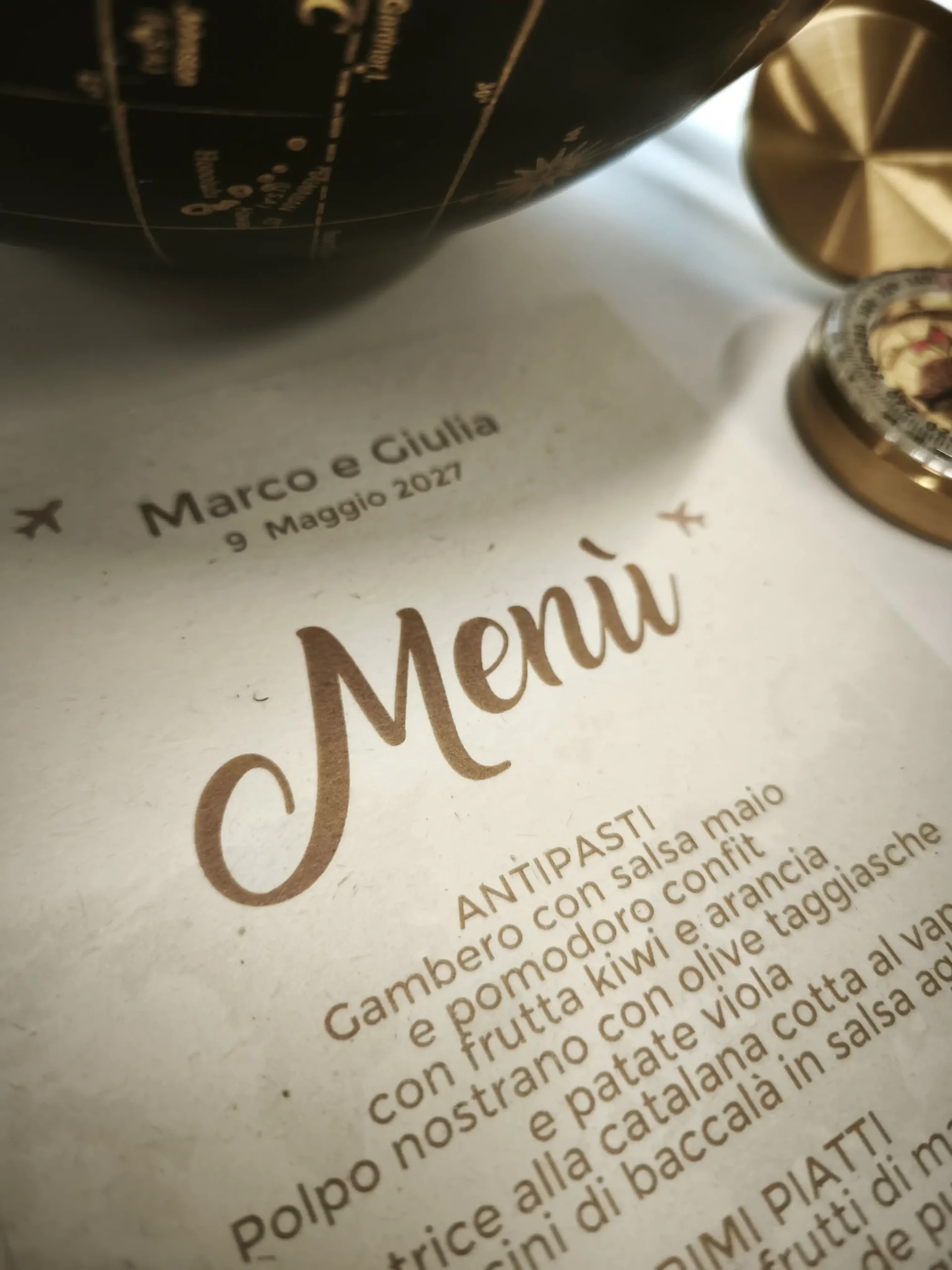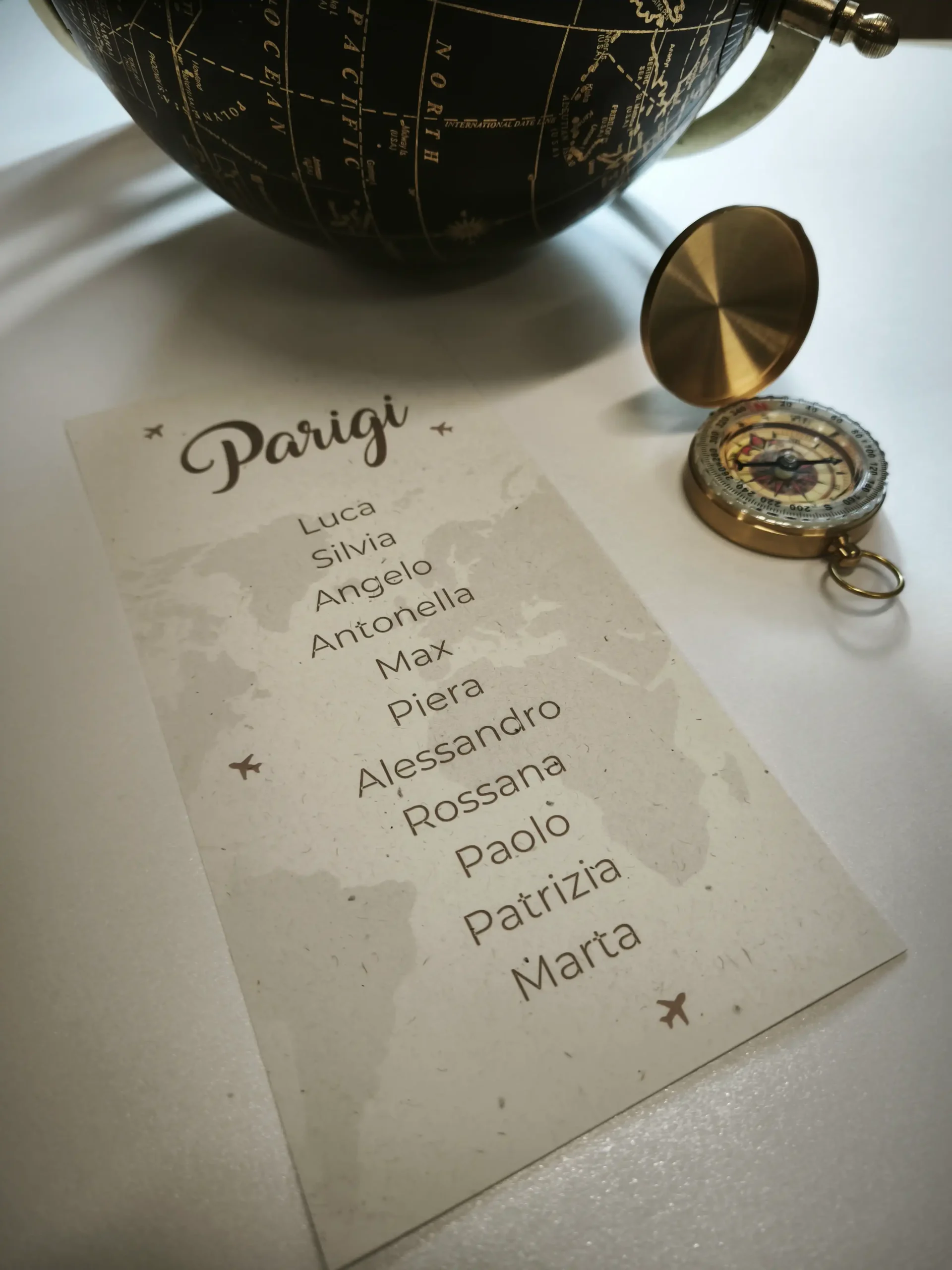 Il design presenta l’intestazione del tavolo in un font calligrafico, accompagnato da un’illustrazione stile mappamondo e cartina geografica di altri tempi che caratterizza l’intera collezione. La spaziatura è studiata per ospitare l’elenco dei vostri ospiti con la massima leggibilità, mantenendo un aspetto pulito e sofisticato. Grazie al suo formato versatile, può essere facilmente appeso a cornici, applicato su basi materiche o inserito in supporti trasparenti.